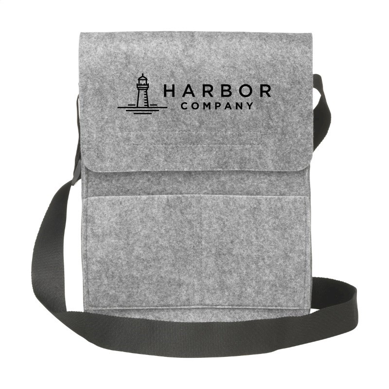 Stevige schoudertas van 3 mm dik RPET vilt (gemaakt van gerecyclede PET-flessen). Met overslag en klittenbandsluiting, 2 insteekvakken en verstelbare schouderriem.