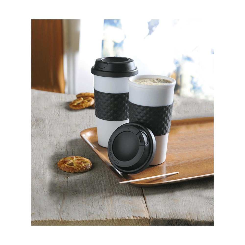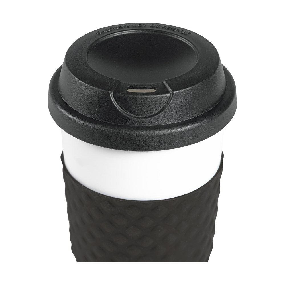 Dubbelwandige, kunststof thermosbeker met schroefdeksel voorzien van drinkopening, rubberen grip, slipvaste, rubberen onderzijde. Met isolerende werking. Inhoud 450 ml. Per stuk in doos.