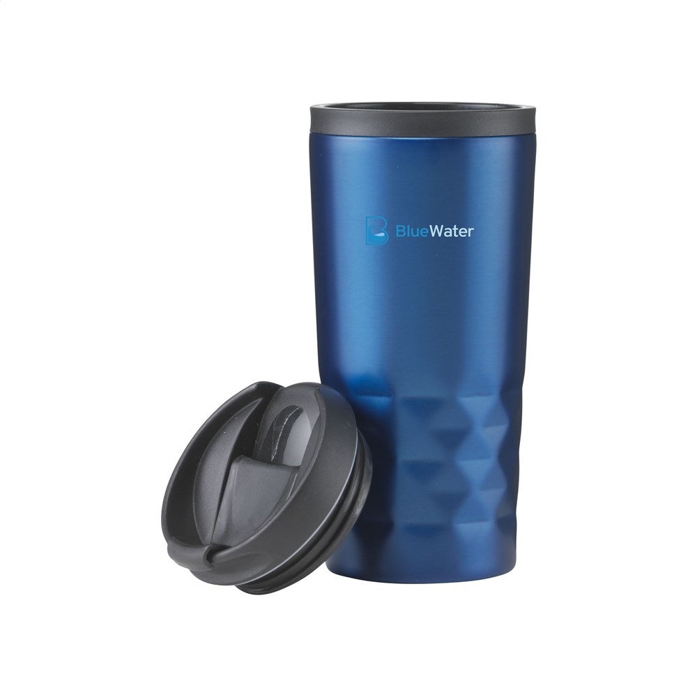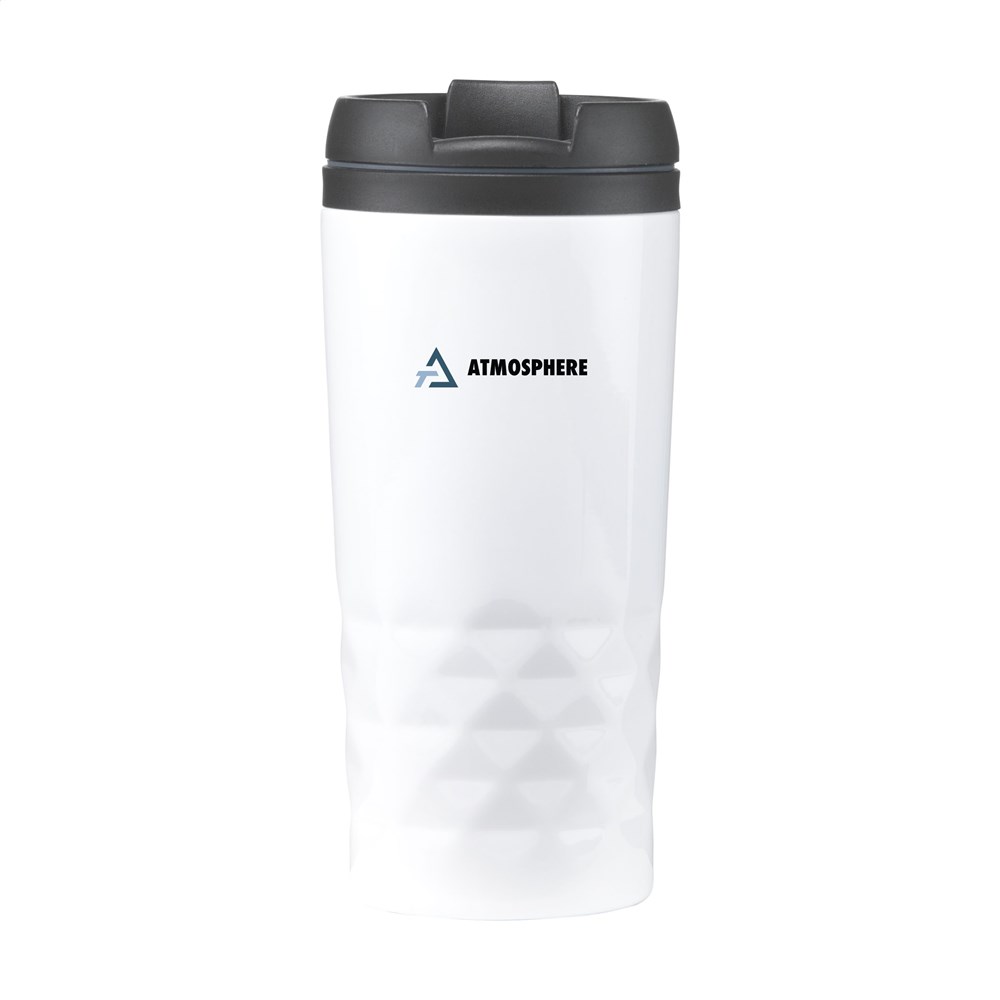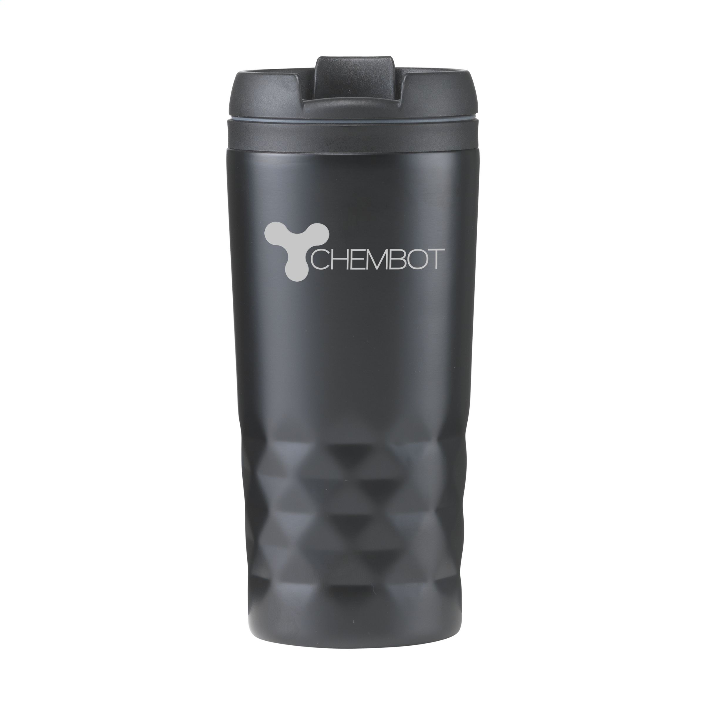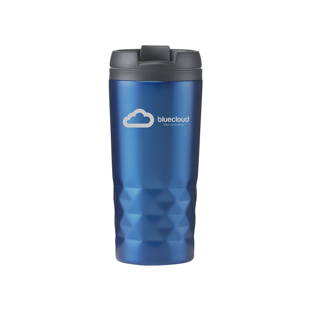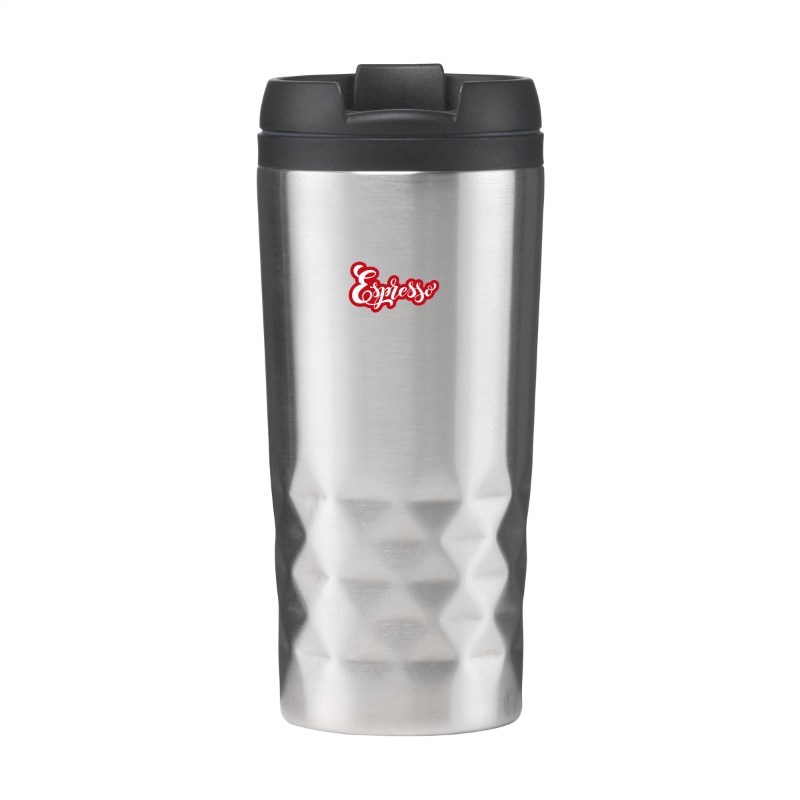 Dubbelwandige, lekvrije, RVS thermosbeker met schroefdeksel en klikopening -kan eenmaal geopend worden vastgeklikt-. Met opvallend 3D-geometrisch diamantpatroon in de houder. Slipvaste onderzijde. Inhoud 300 ml. Per stuk in doos.
