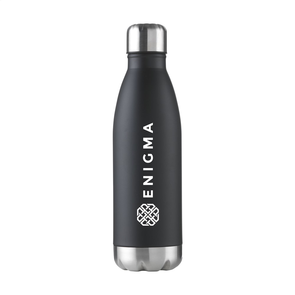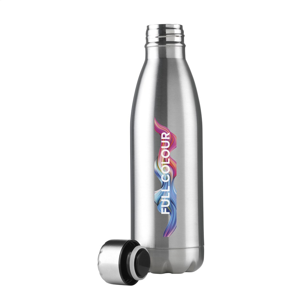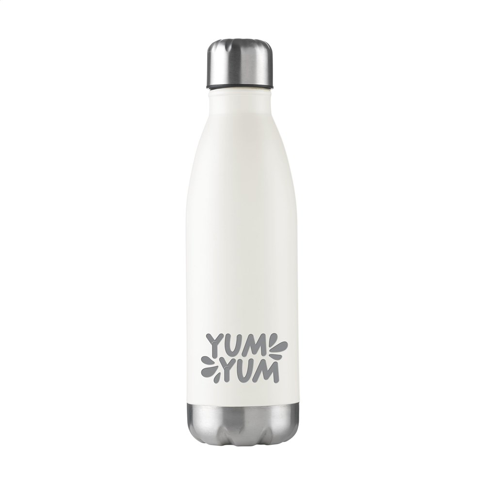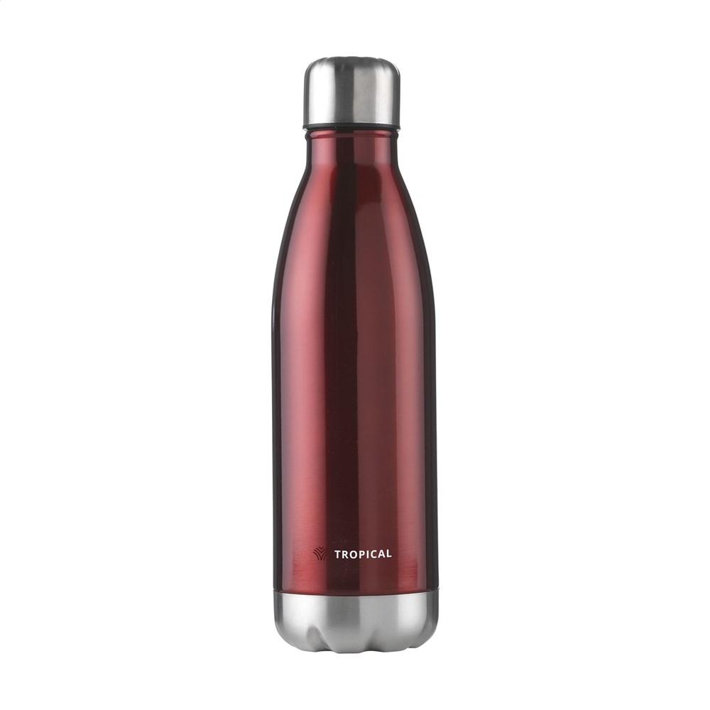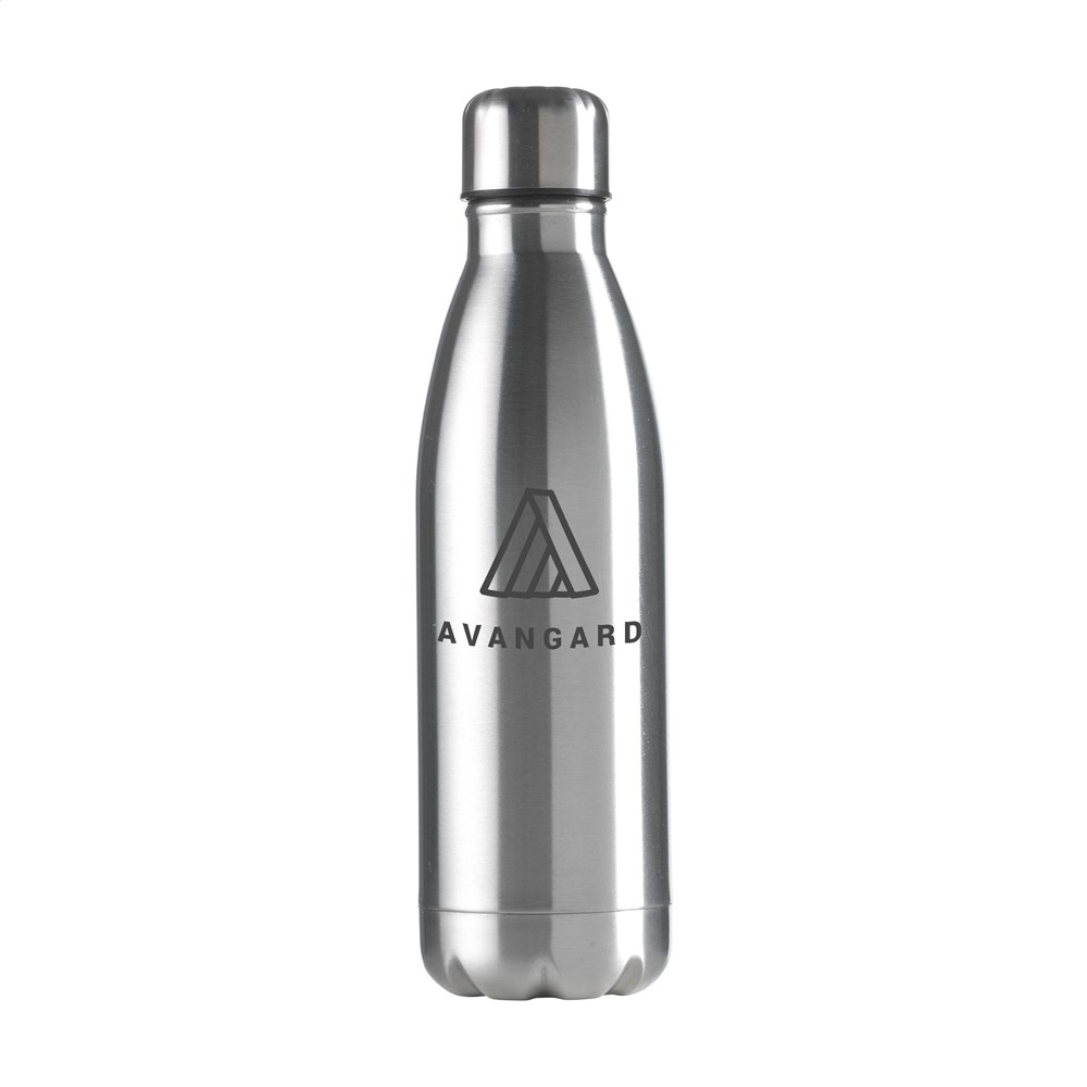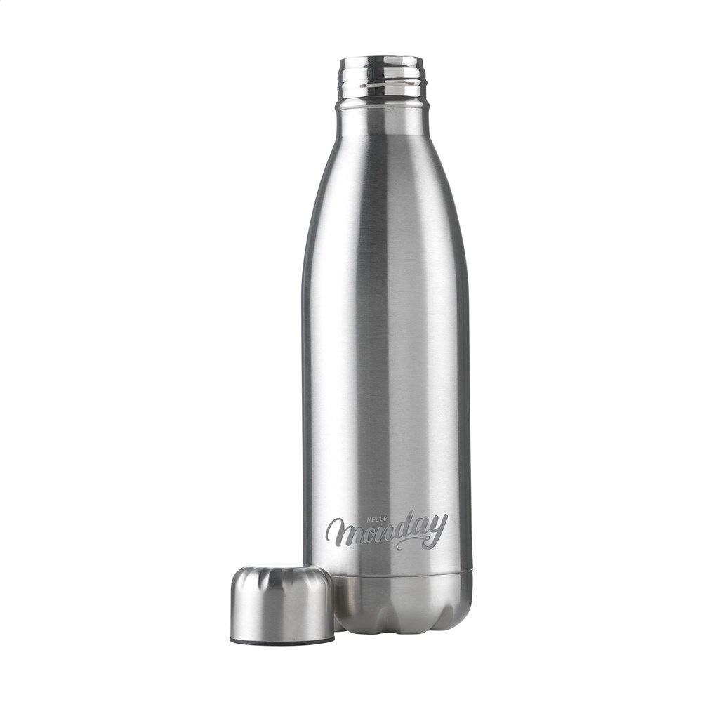 Dubbelwandige, vacuüm geïsoleerde, RVS waterfles/thermosfles. Met lekvrije schroefdop. Uitgevoerd in metallic of met mooie toplaag in matte finish (alleen de zwarte en de witte). Geschikt voor het op temperatuur houden van koude of warme dranken. Inhoud 500 ml. Per stuk in doos.