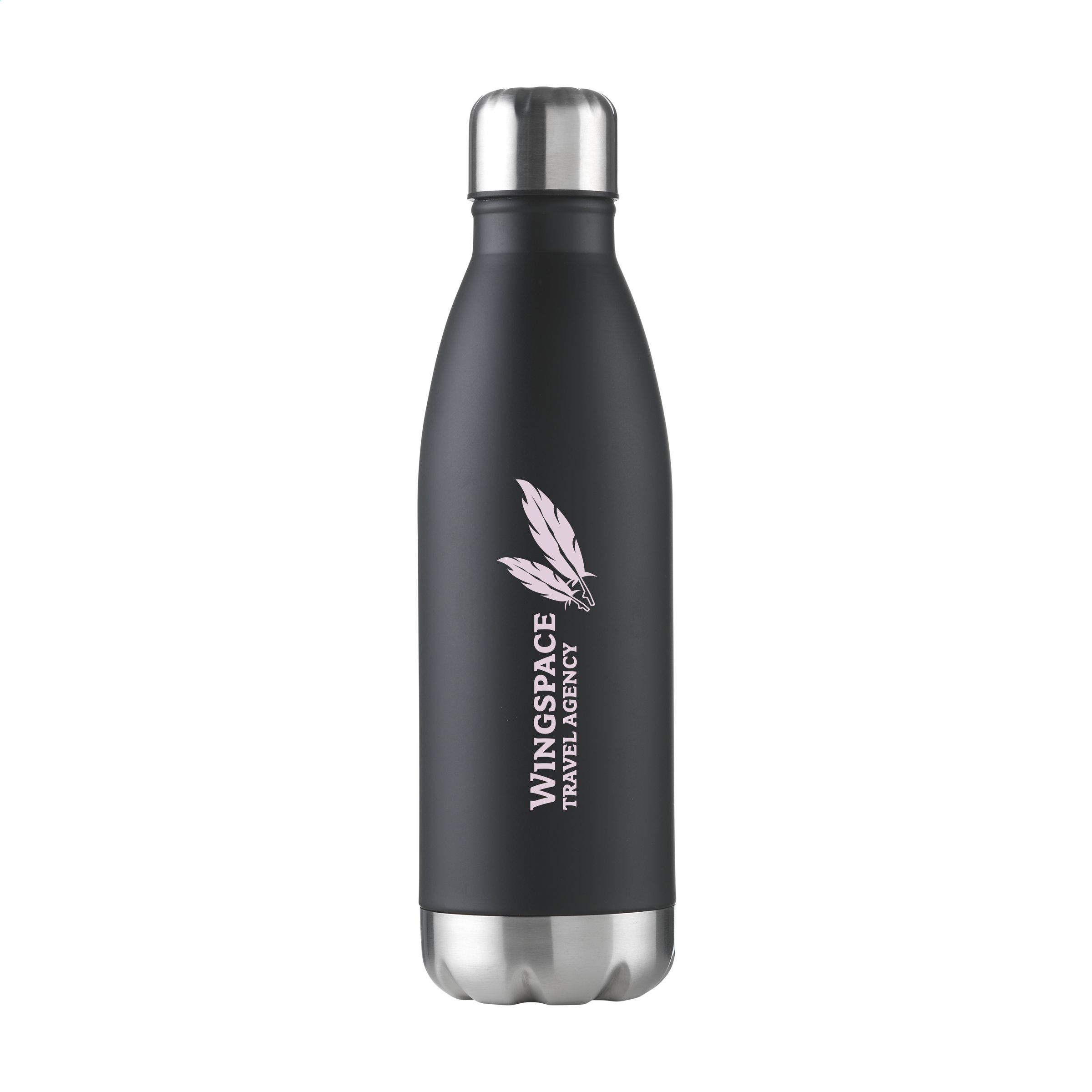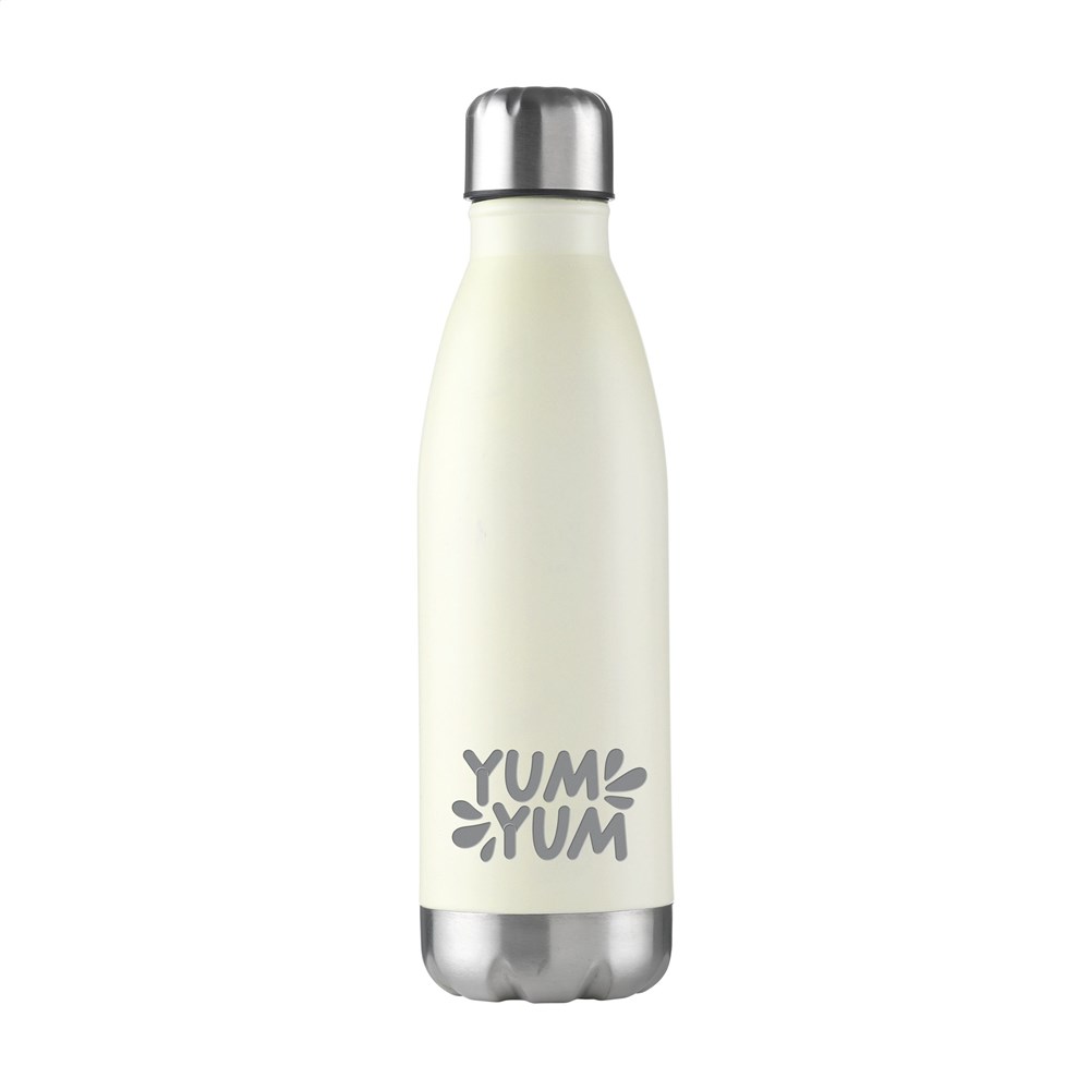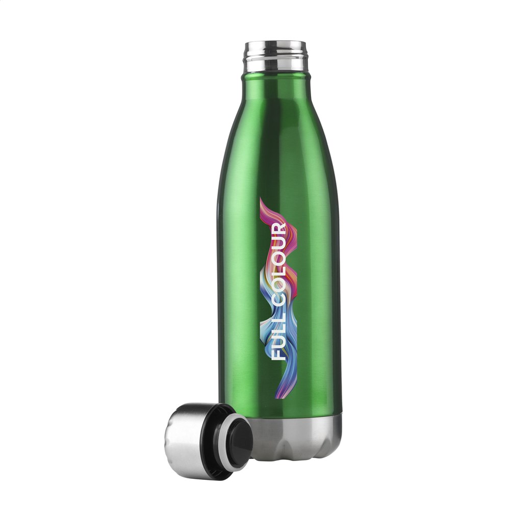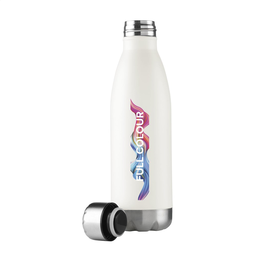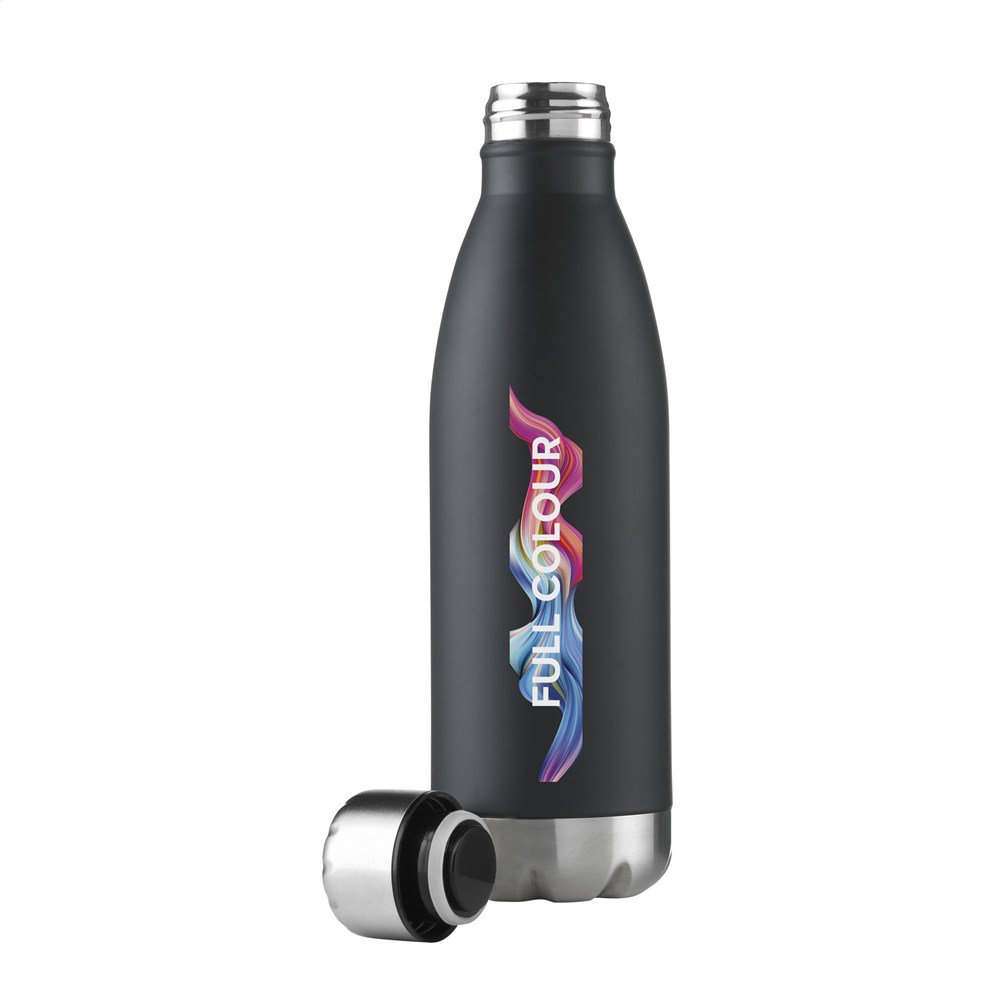 Dubbelwandige, vacuüm geïsoleerde, RVS waterfles/thermosfles. Met lekvrije schroefdop. Uitgevoerd in metallic of met mooie toplaag in matte finish (alleen de zwarte en de witte). Geschikt voor het op temperatuur houden van koude of warme dranken. Inhoud 500 ml. Per stuk in doos.