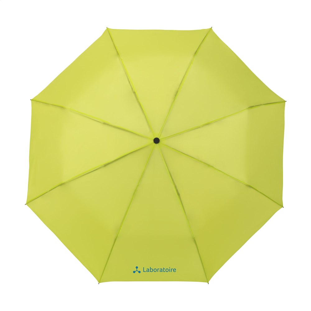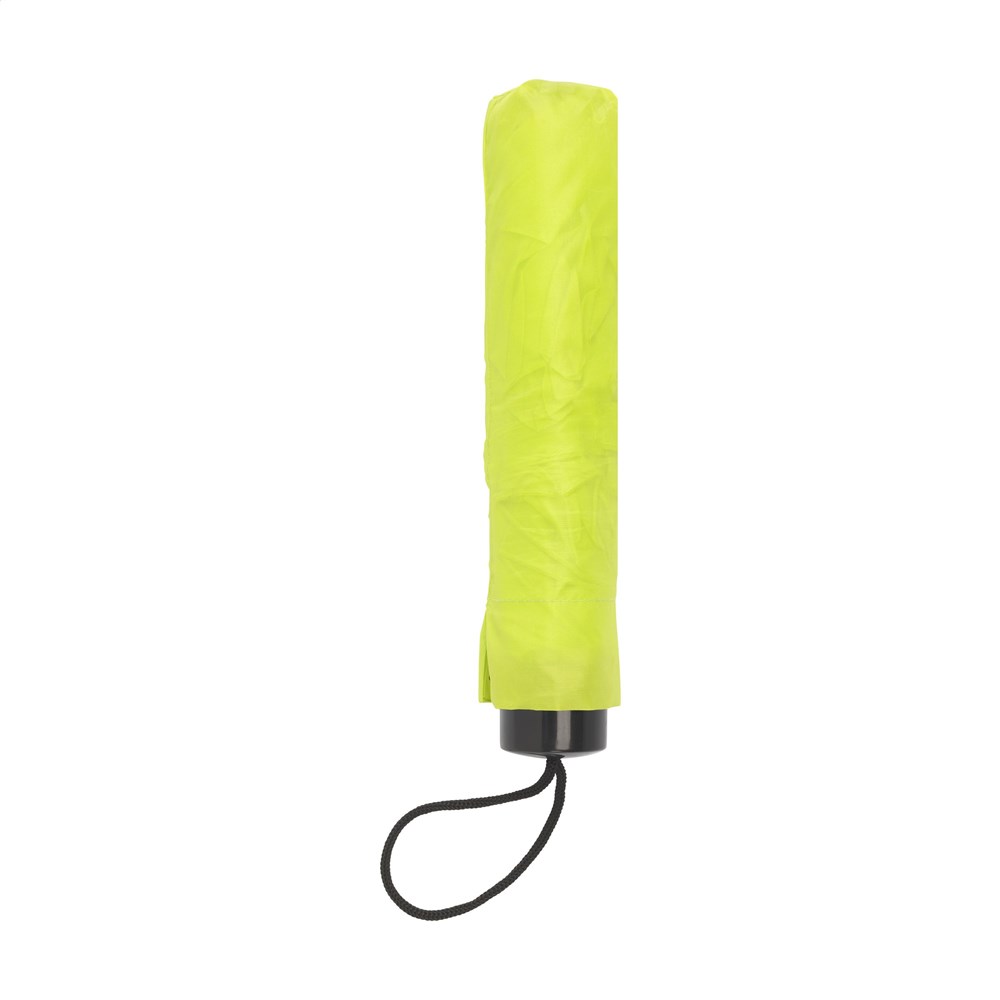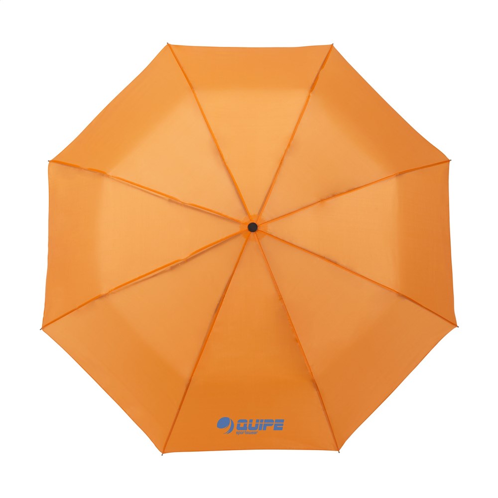 Compacte, opvouwbare paraplu met 190T polyester bespanning. Metalen frame en steel, kunststof hangreep met lus, klittenbandsluiting en opberghoes. Manuele bediening.