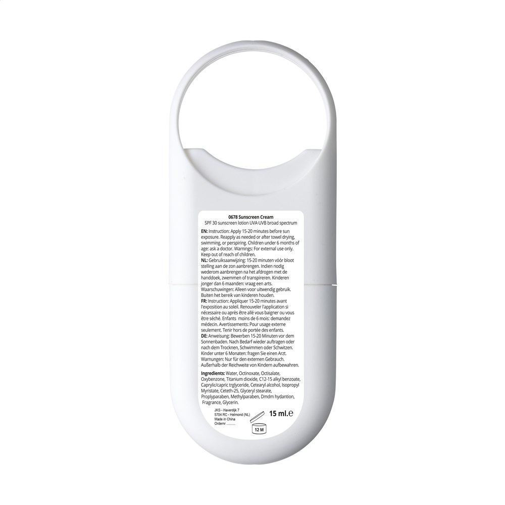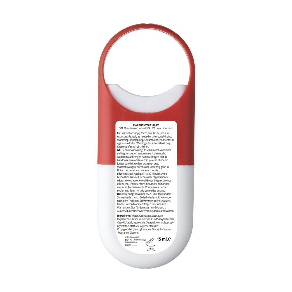 Beschermende zonnebrandlotion (factor 30) in handzaam, kunststof flacon met verstuiver en groot ophangoog. Houdbaar tot 12 maanden na opening. Inhoud 15 ml. Ingrediënten: Water, Octinoxate, Octisalate, Oxybenzone, Titanium dioxide, C12-15 alkyl benzoate, Caprylic/capric triglyceride, Cetearyl alcohol, Isopropyl Myristate, Ceteth-25, Glyceryl stearate, Proplyparaben, Methylparaben, Dmdm hydantoin, Fragrance, Glycerin.