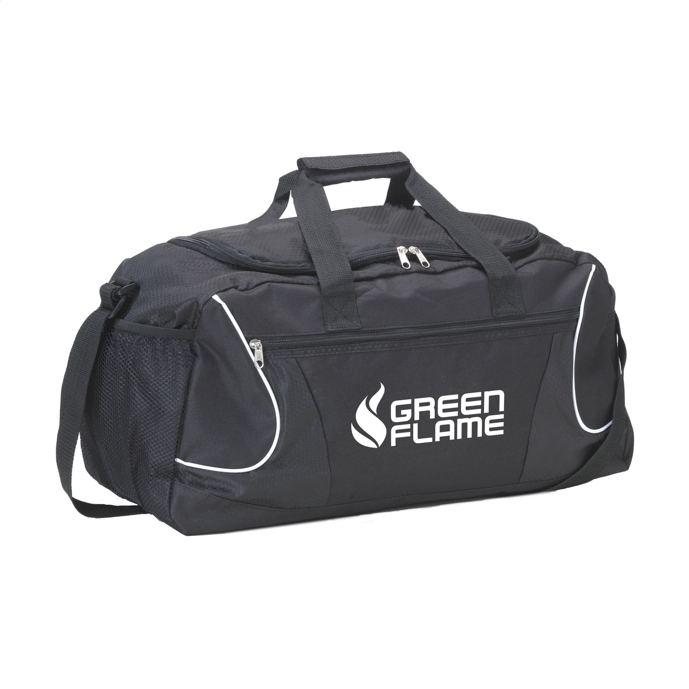 Ruime sport-/reistas van 600D polyester. Met ritsvak aan de voorzijde, gaasvak, 2 handgrepen en verstelbare schouderriem. Inhoud 22 liter.
