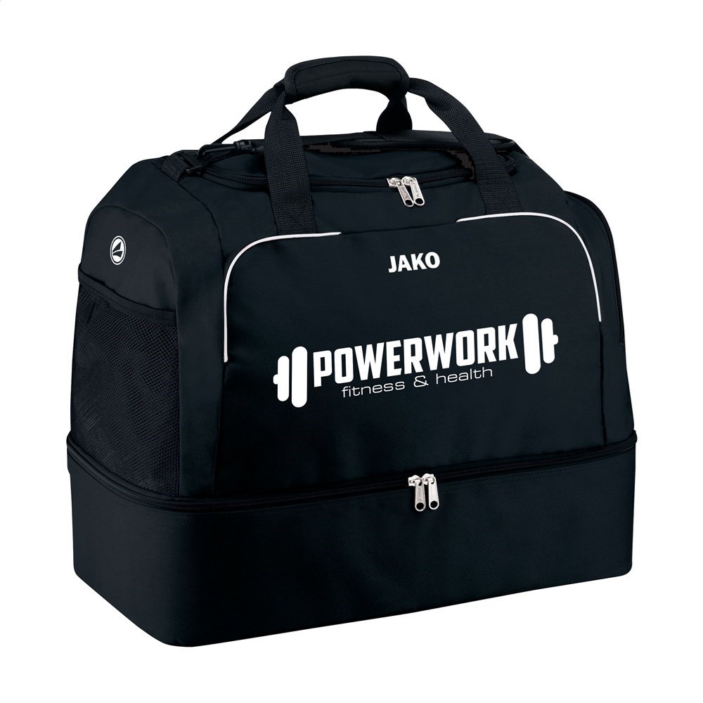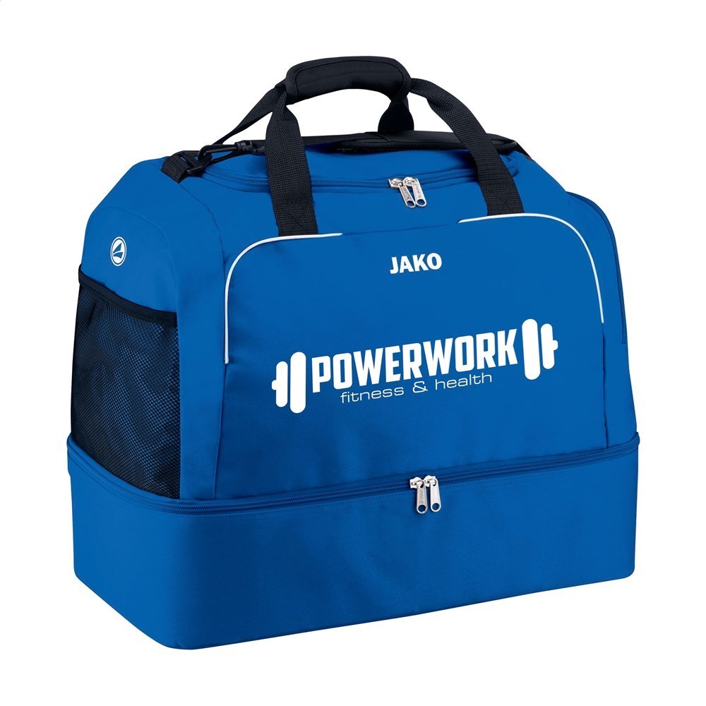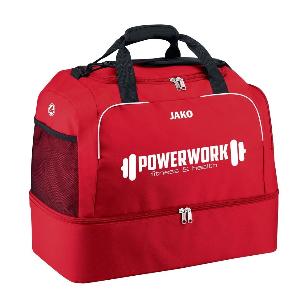 Sporttas van het merk Jako®. Van hoge kwaliteit 600D polyester. Met afneembare/verstelbare schouderriem, 2 draaglussen, royaal hoofdvak met klein ristvakje, extra ruim zijvak voor het opbergen van natte spullen en mesh zijvak, beschermnoppen aan de onderzijde. Het ruime, verstevigde bodemvak biedt extra opbergruimte voor bijvoorbeeld sportschoenen.