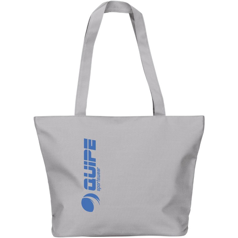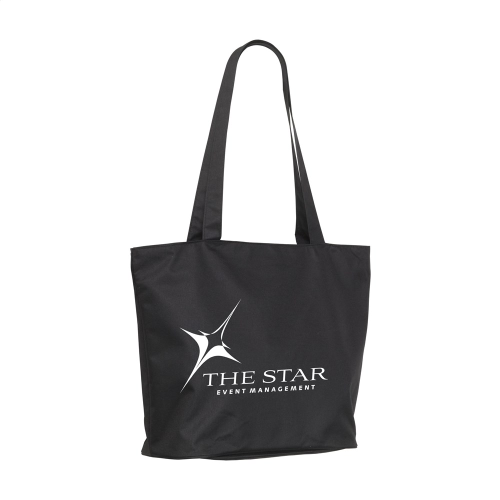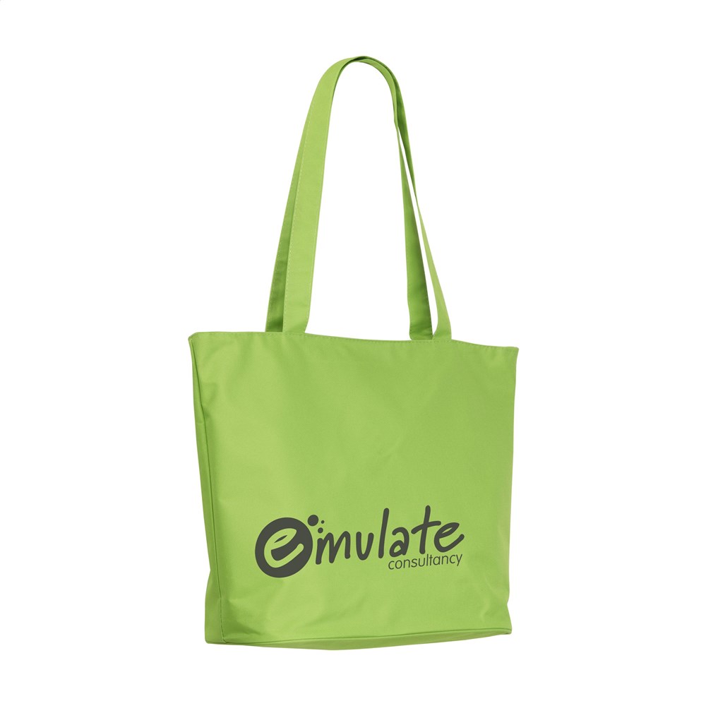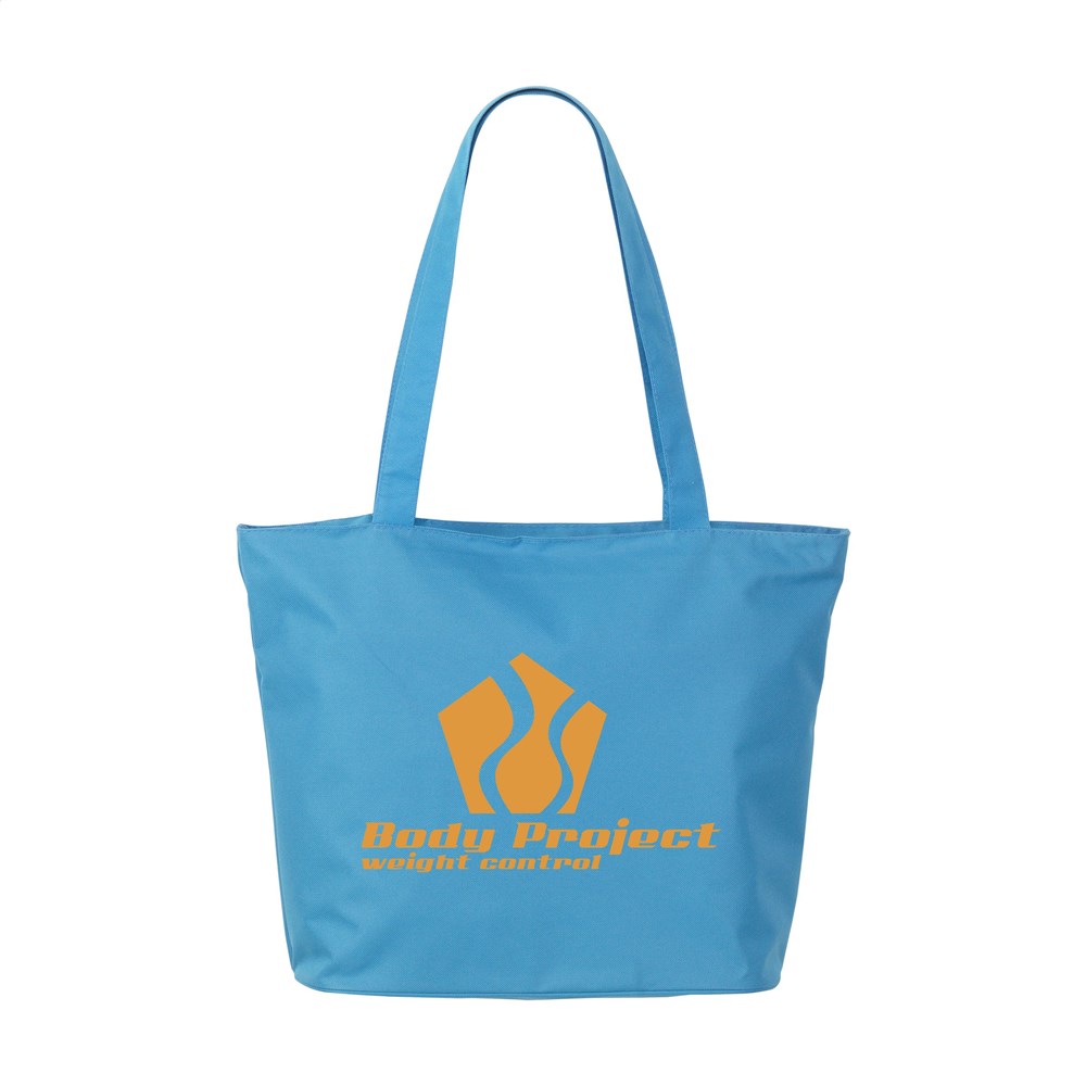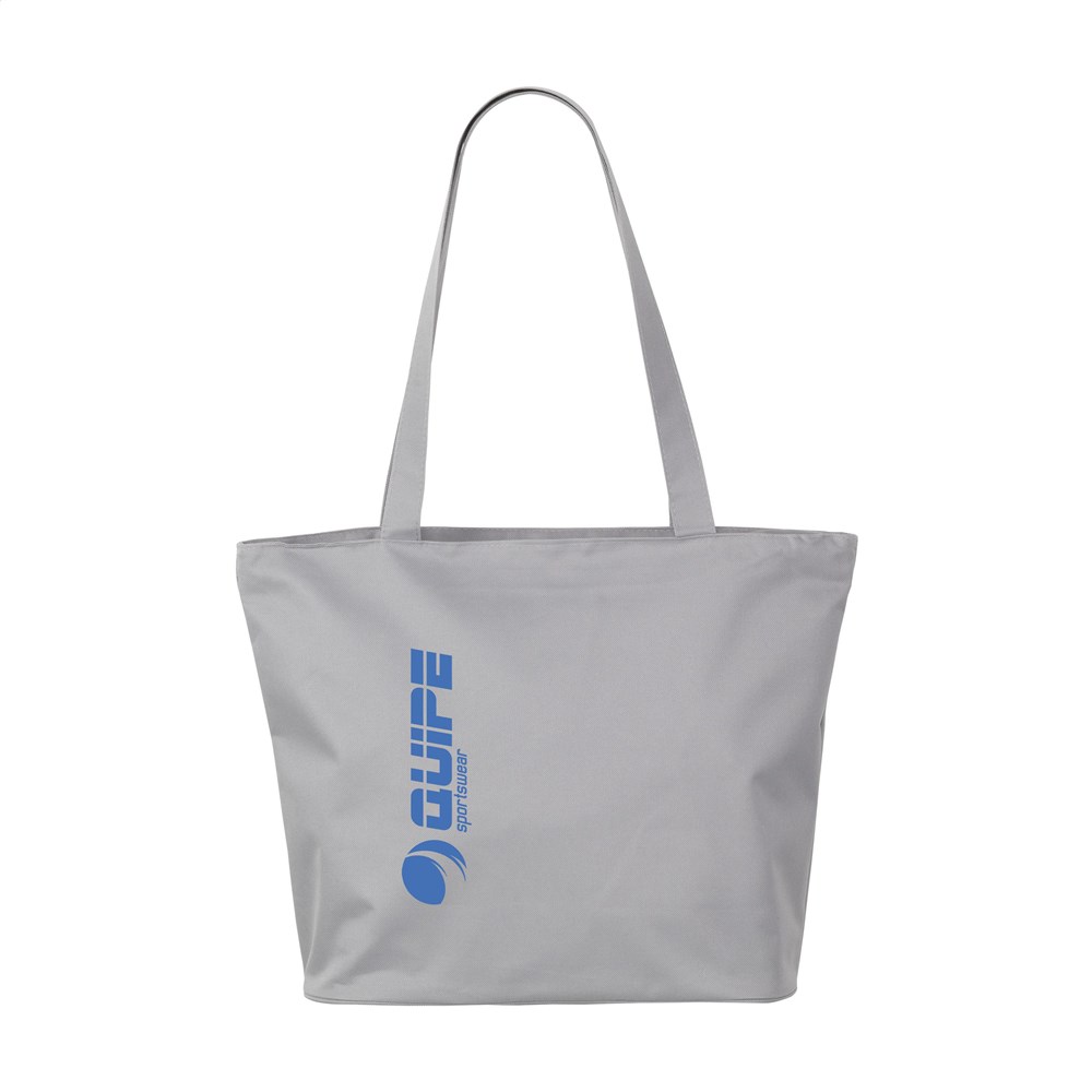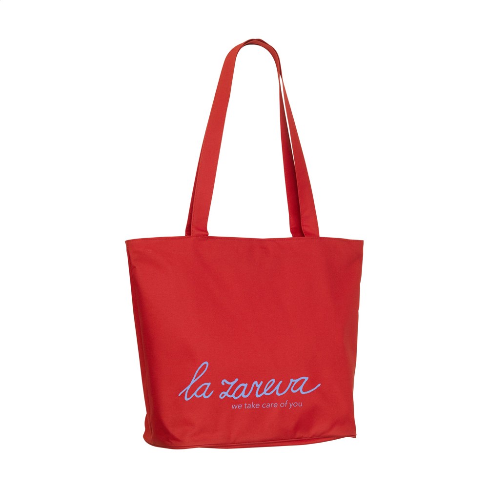 Prachtige, stevige tas van 600D polyester met verstevigde binnenzijde, lange hengsels, ritssluiting en opbergvakje met rits. De brede bodem is aan de buitenzijde mooi en strak afgewerkt met een ronde bies. Multifunctioneel in te zetten als shopper, boodschappentas en strandtas.