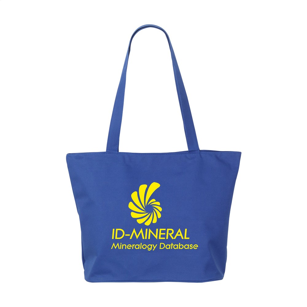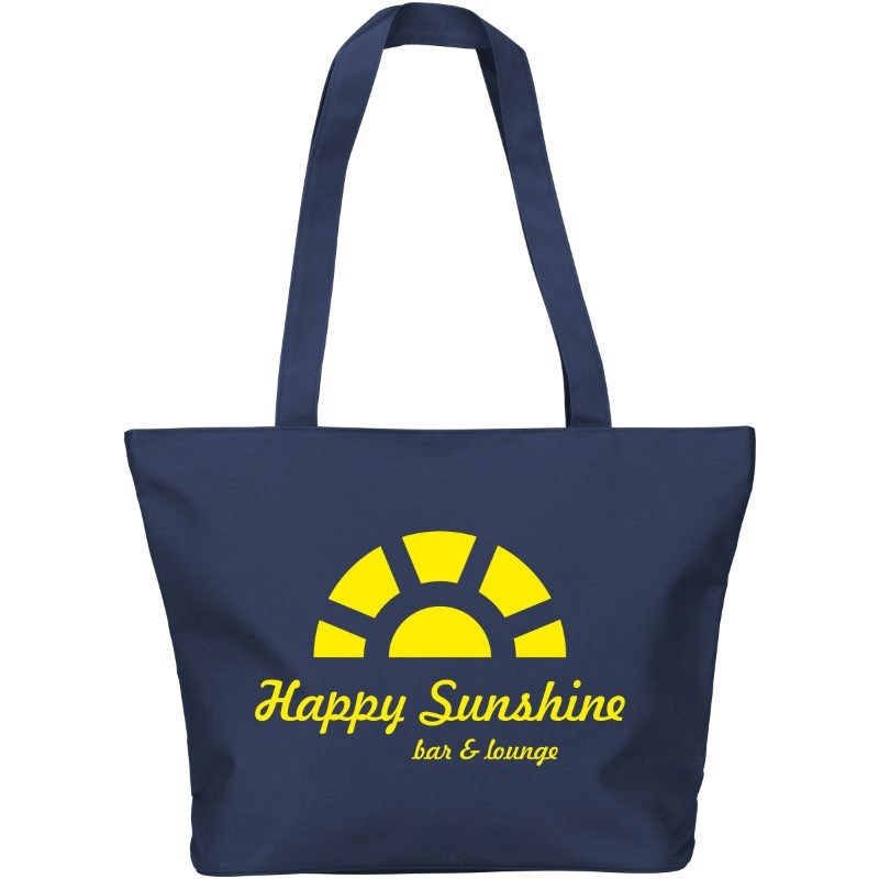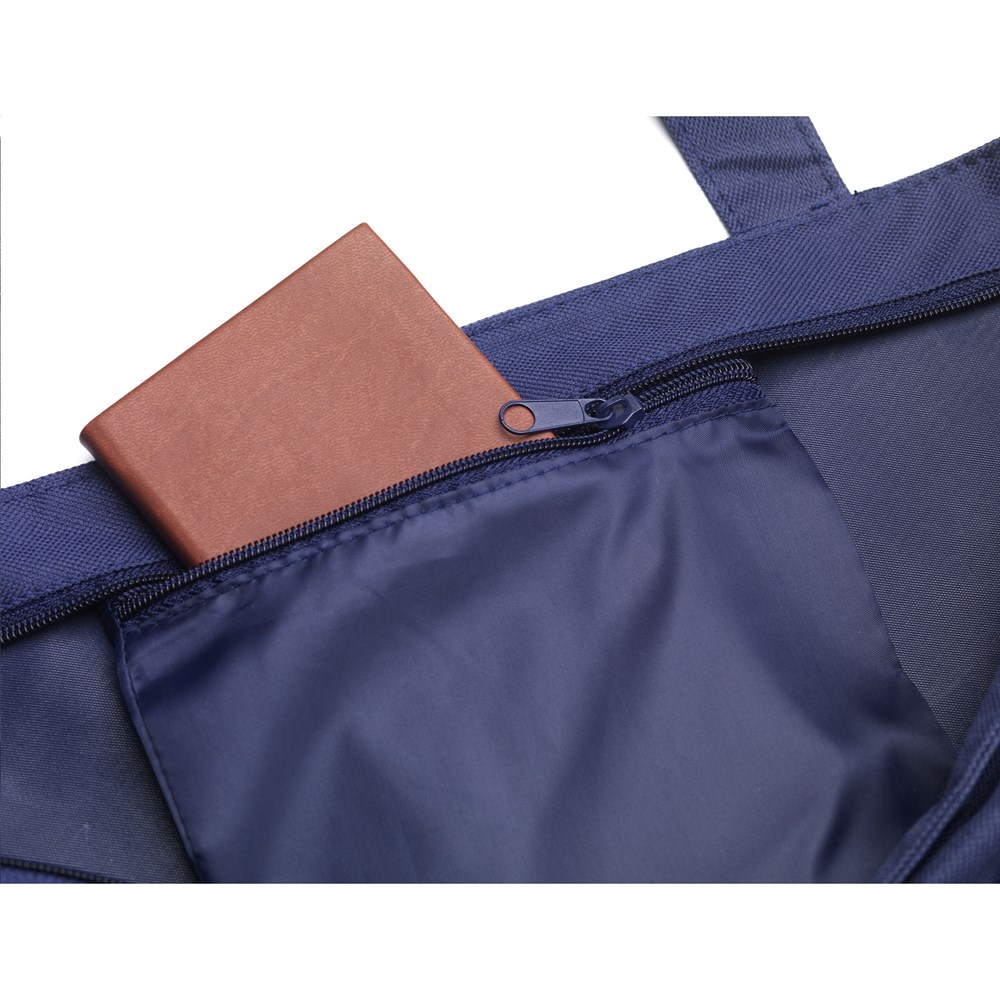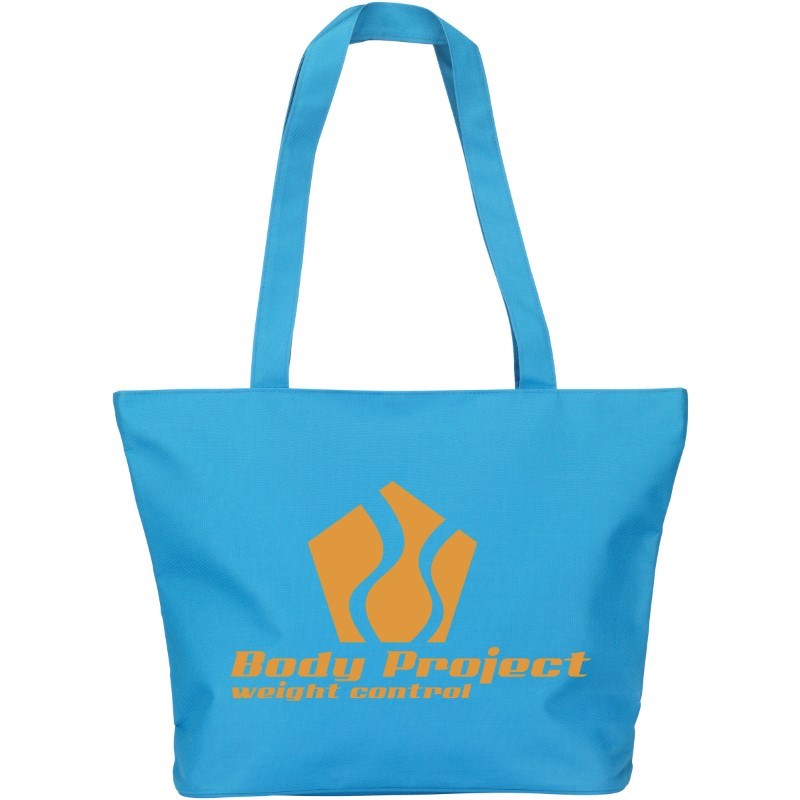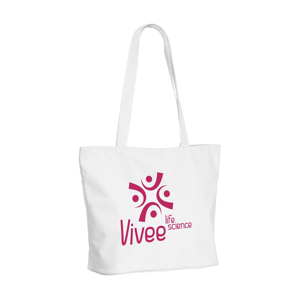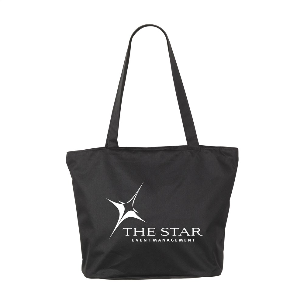 Prachtige, stevige tas van 600D polyester met verstevigde binnenzijde, lange hengsels, ritssluiting en opbergvakje met rits. De brede bodem is aan de buitenzijde mooi en strak afgewerkt met een ronde bies. Multifunctioneel in te zetten als shopper, boodschappentas en strandtas.