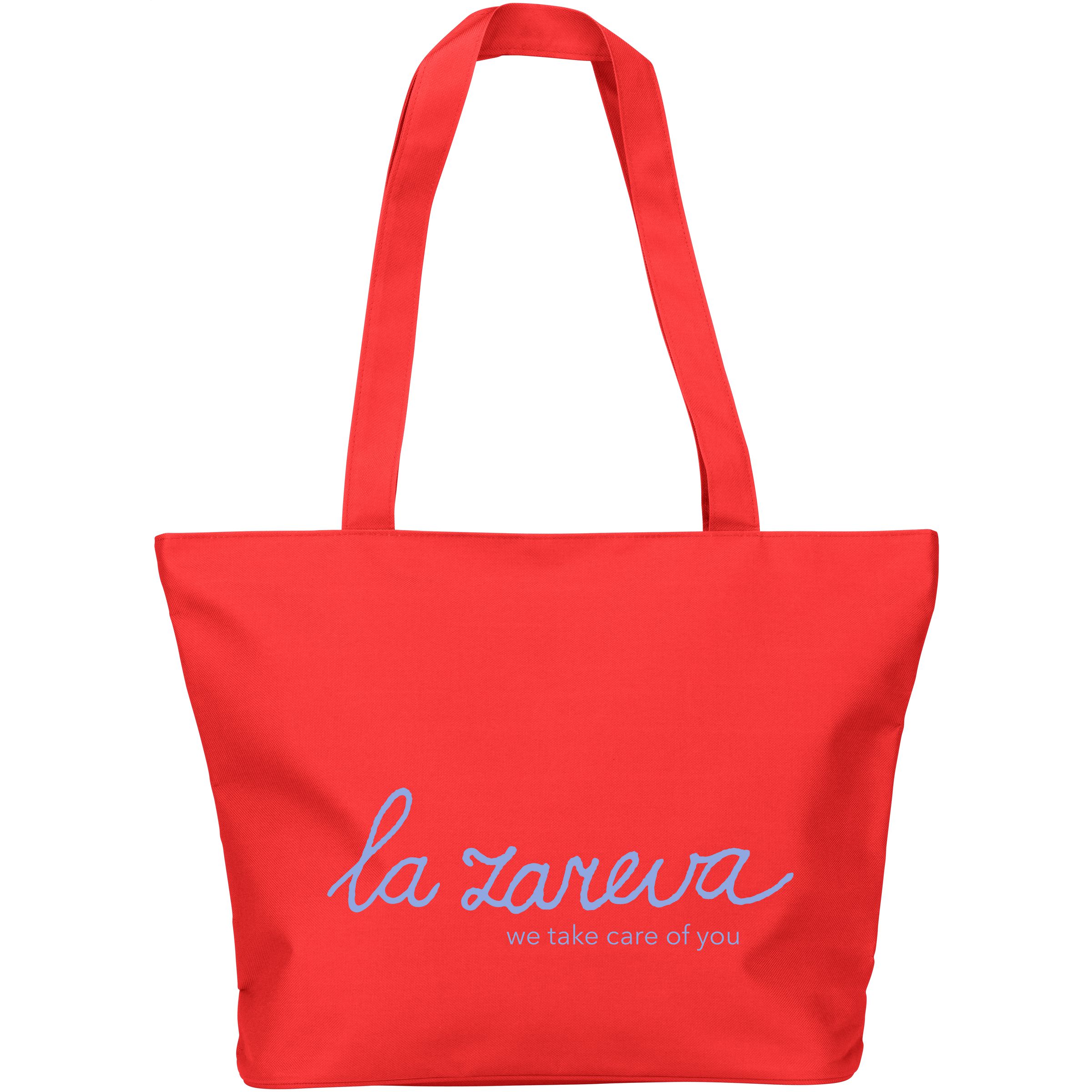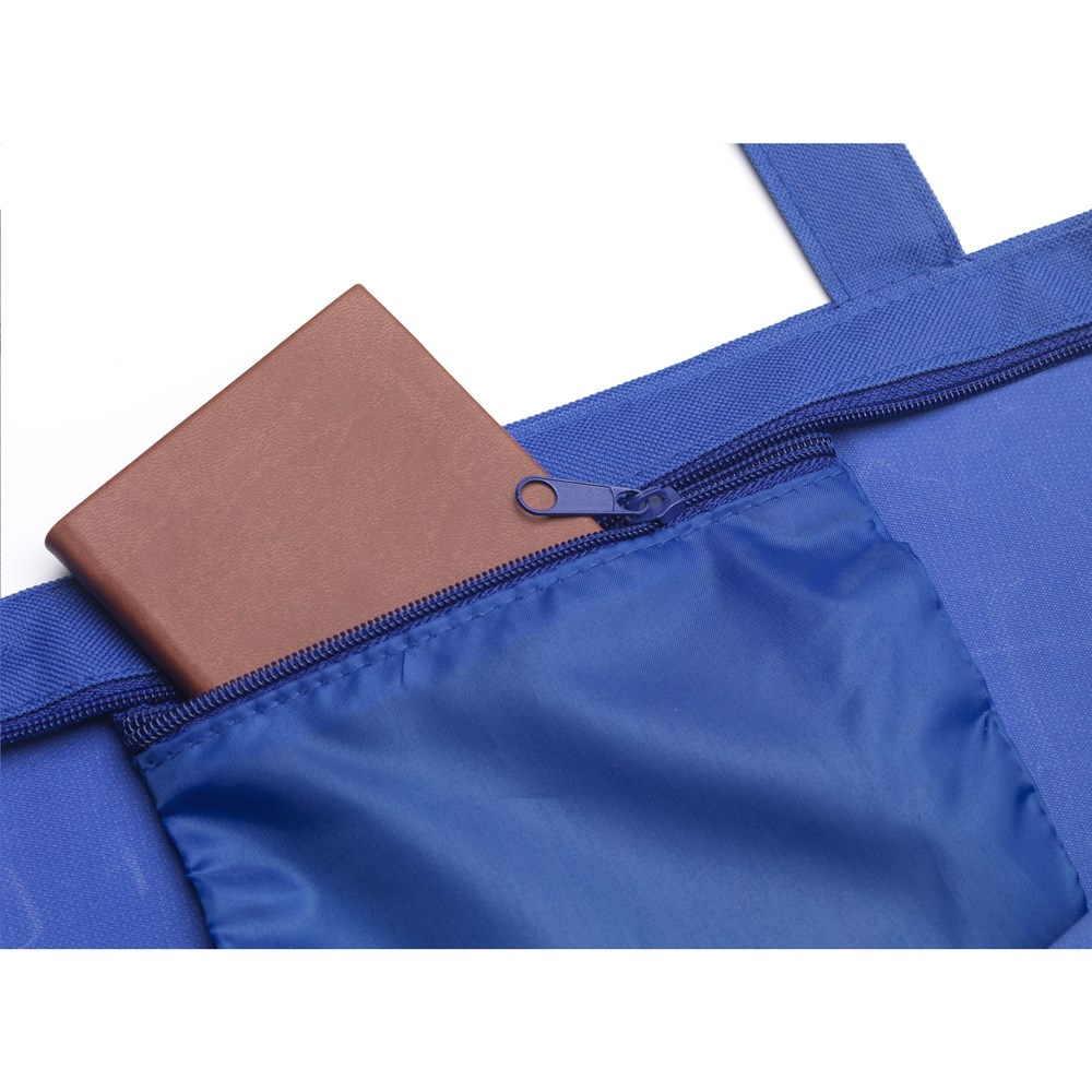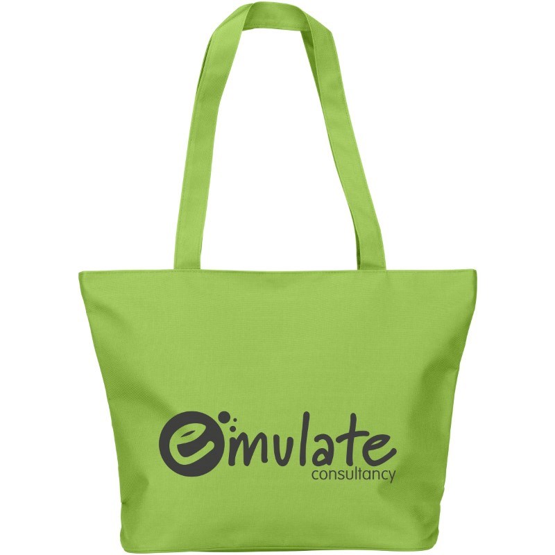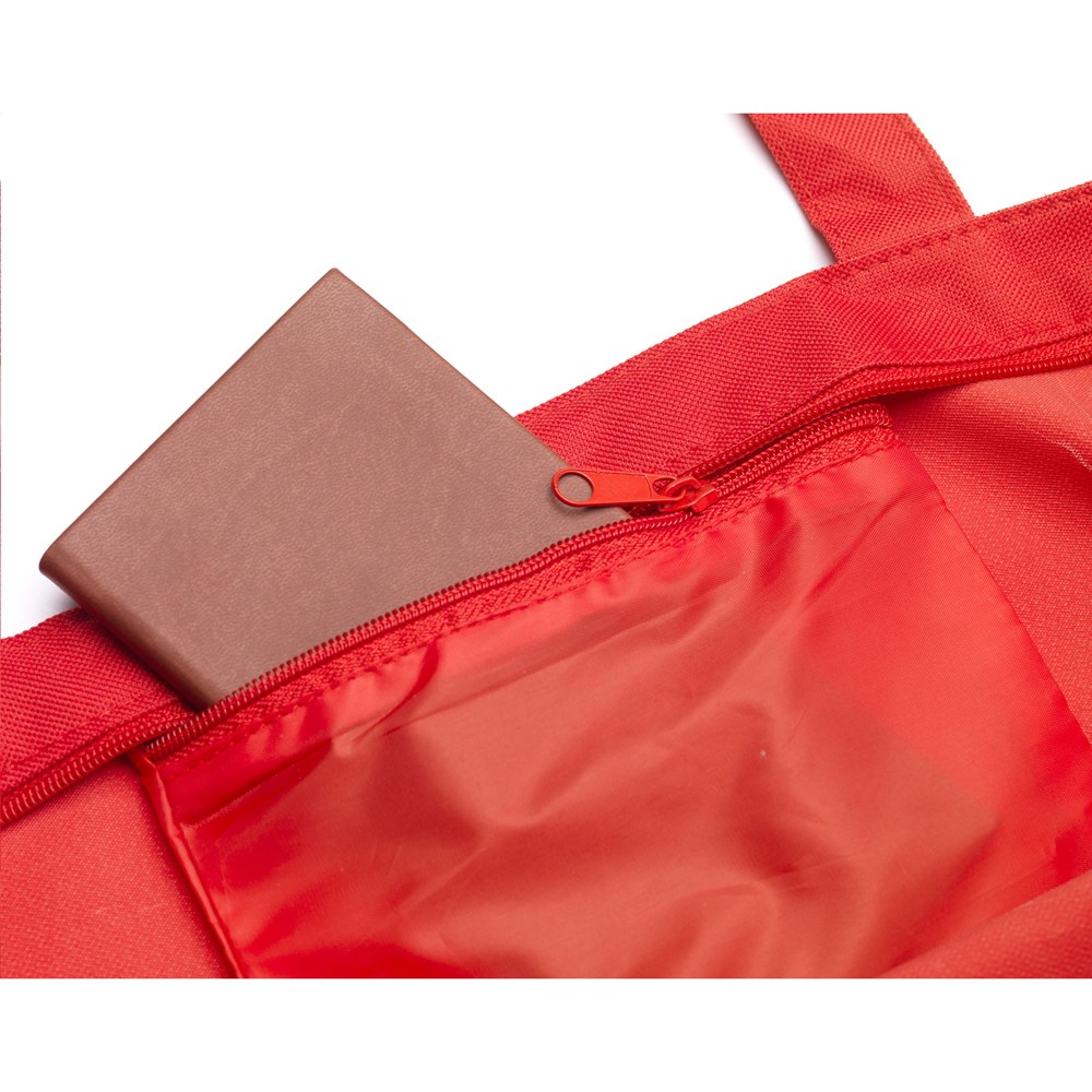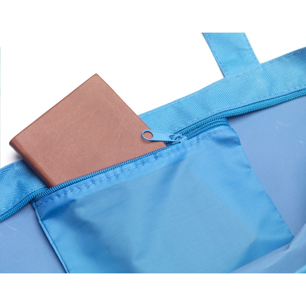 Prachtige, stevige tas van 600D polyester met verstevigde binnenzijde, lange hengsels, ritssluiting en opbergvakje met rits. De brede bodem is aan de buitenzijde mooi en strak afgewerkt met een ronde bies. Multifunctioneel in te zetten als shopper, boodschappentas en strandtas.