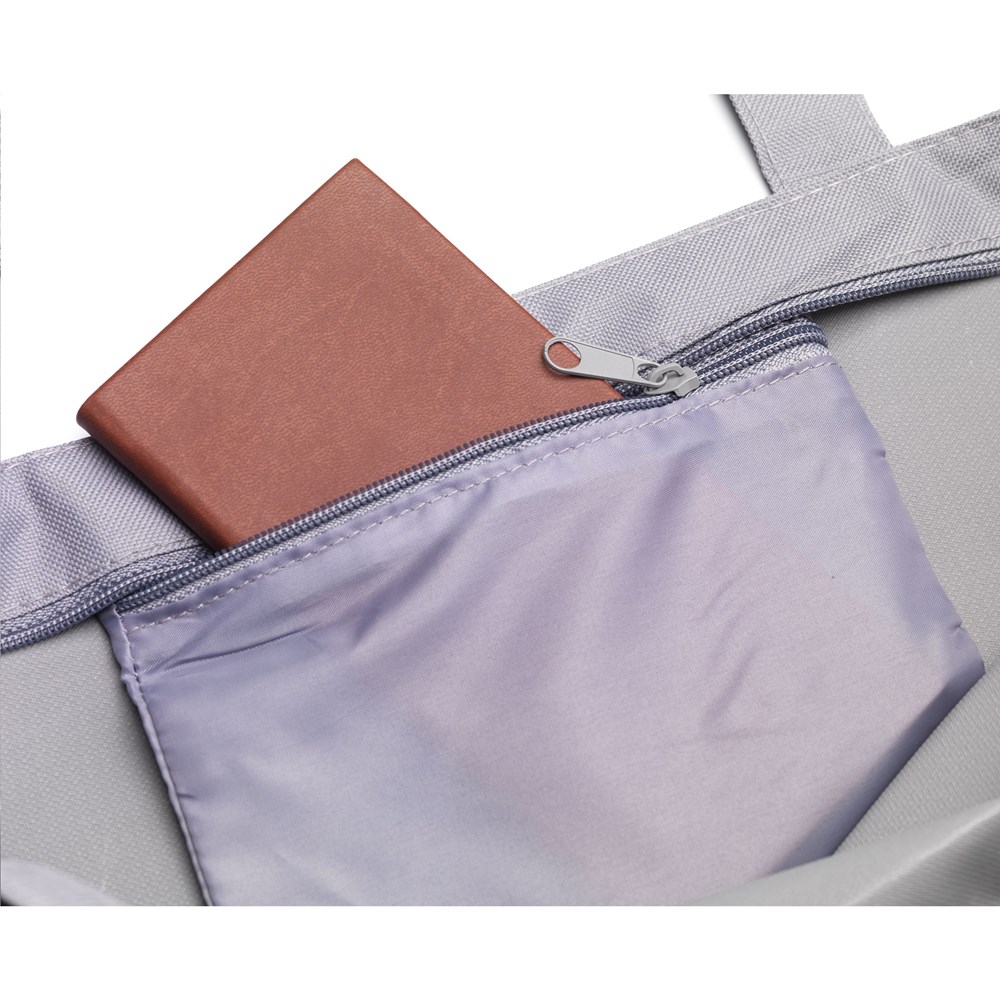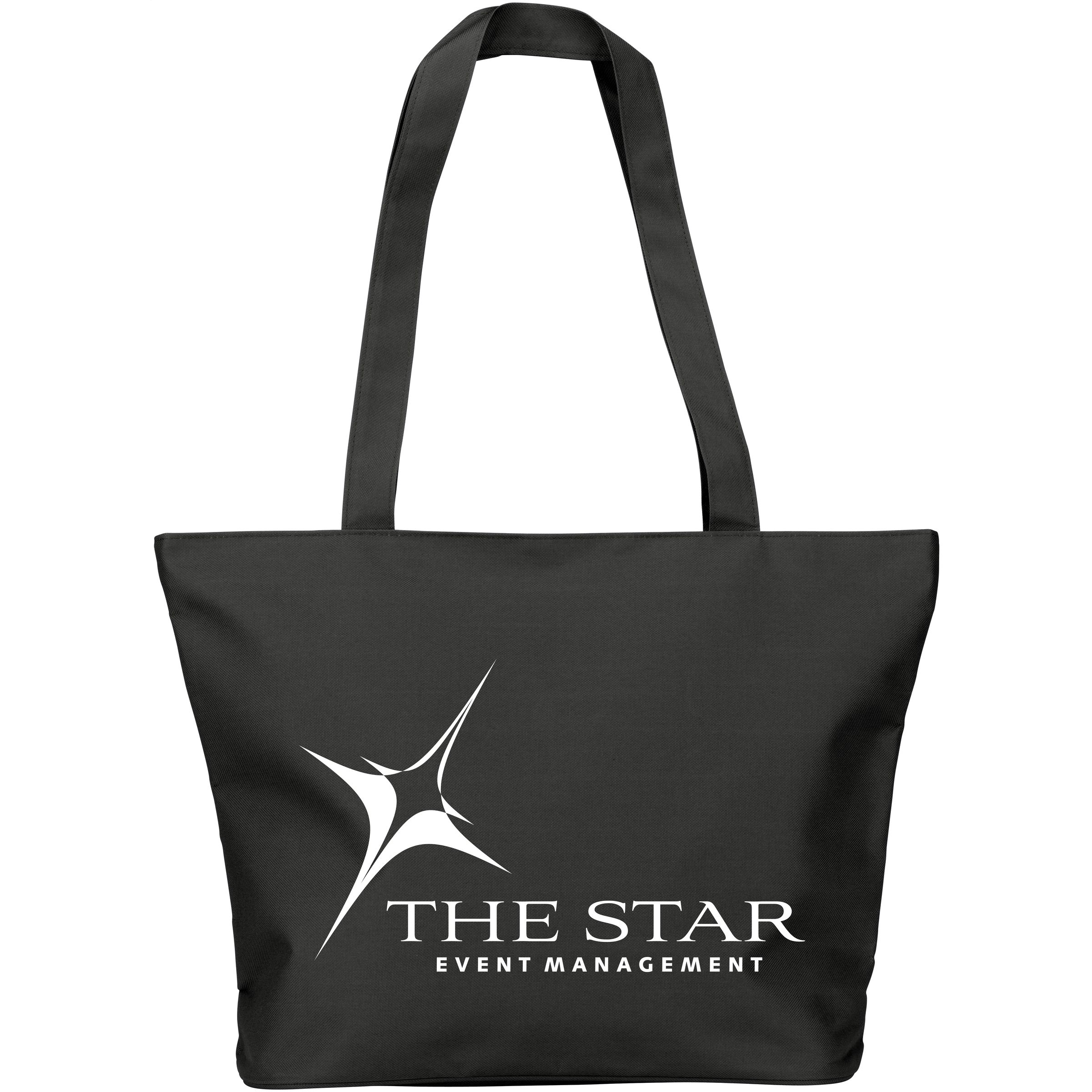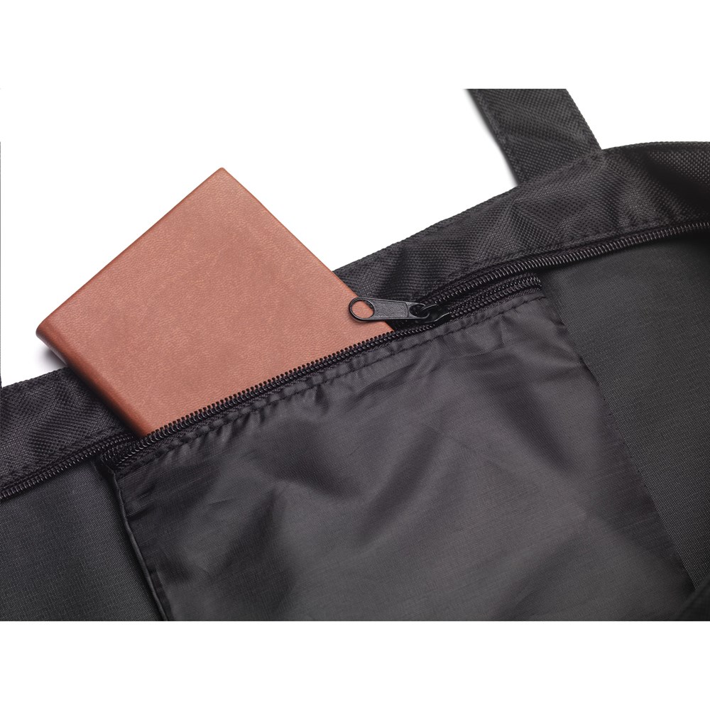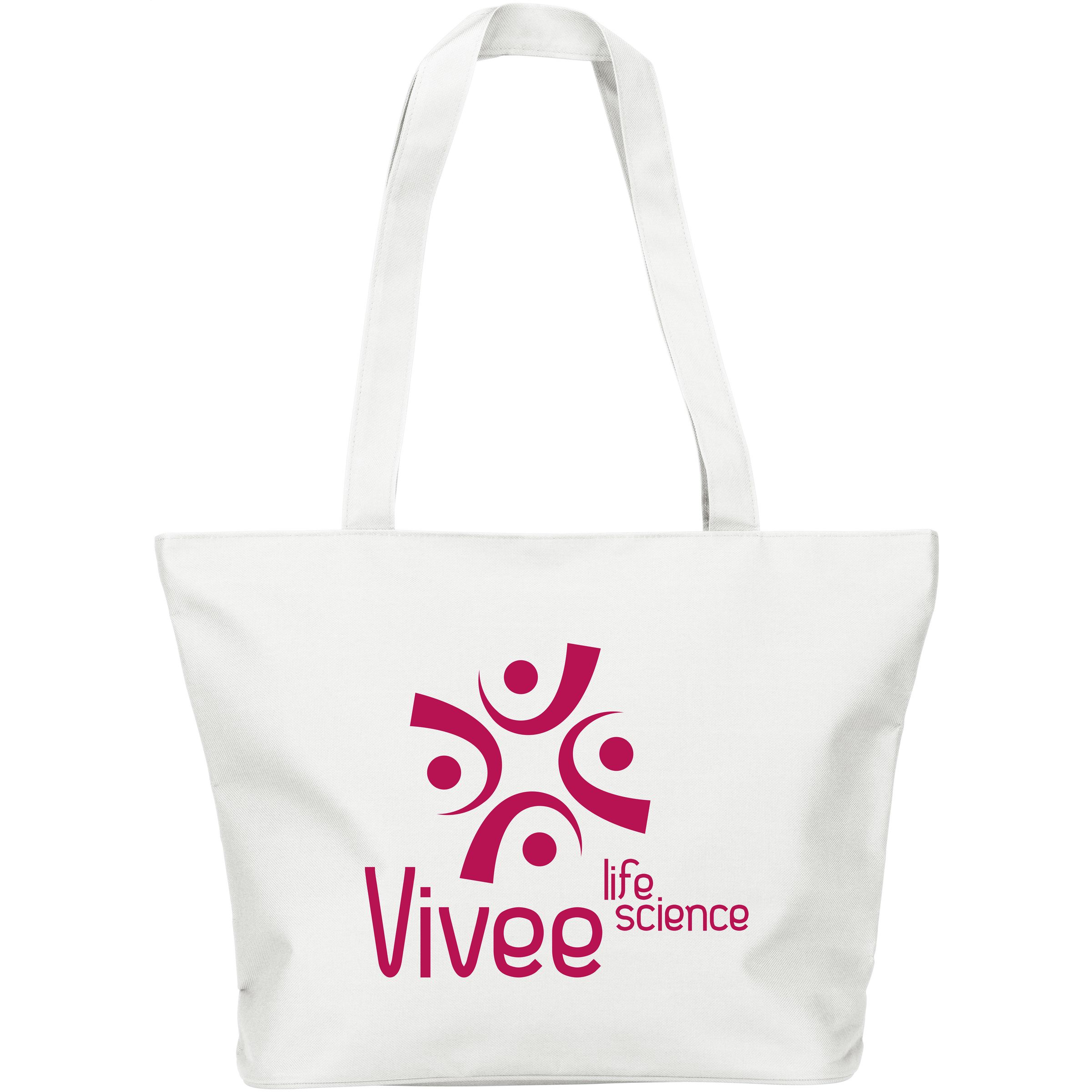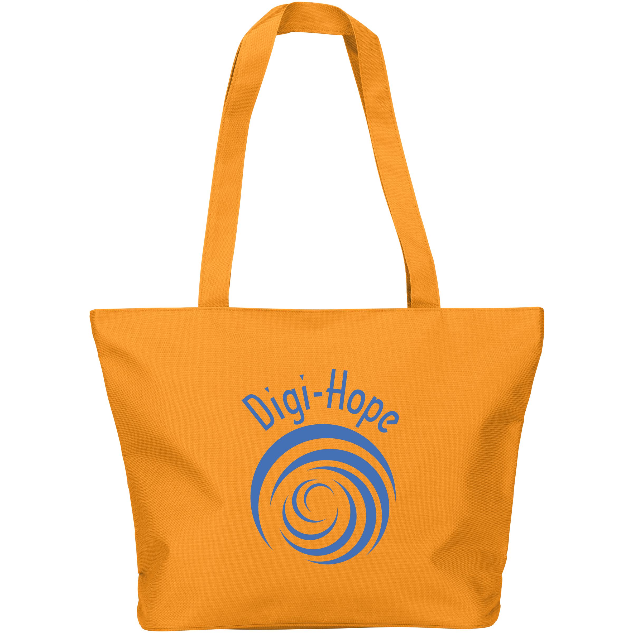 Prachtige, stevige tas van 600D polyester met verstevigde binnenzijde, lange hengsels, ritssluiting en opbergvakje met rits. De brede bodem is aan de buitenzijde mooi en strak afgewerkt met een ronde bies. Multifunctioneel in te zetten als shopper, boodschappentas en strandtas.