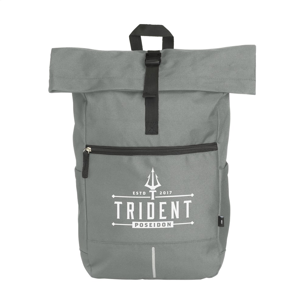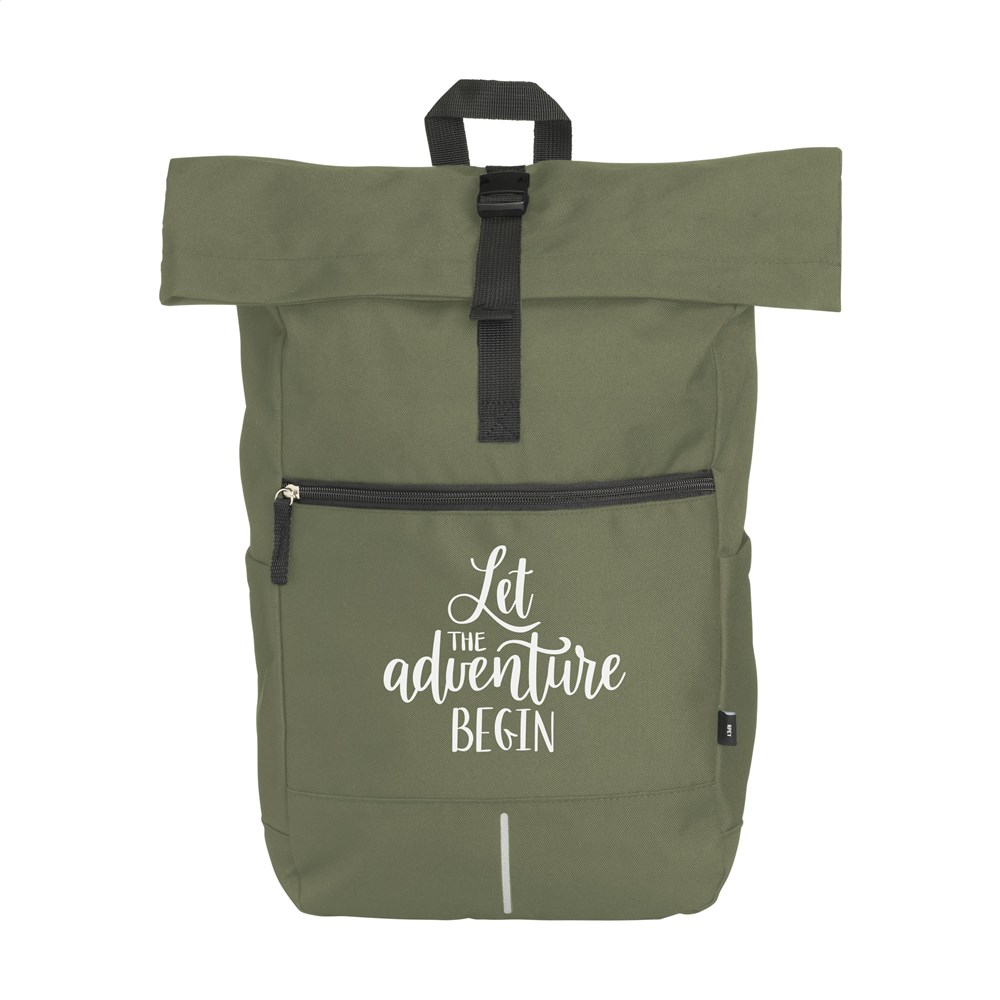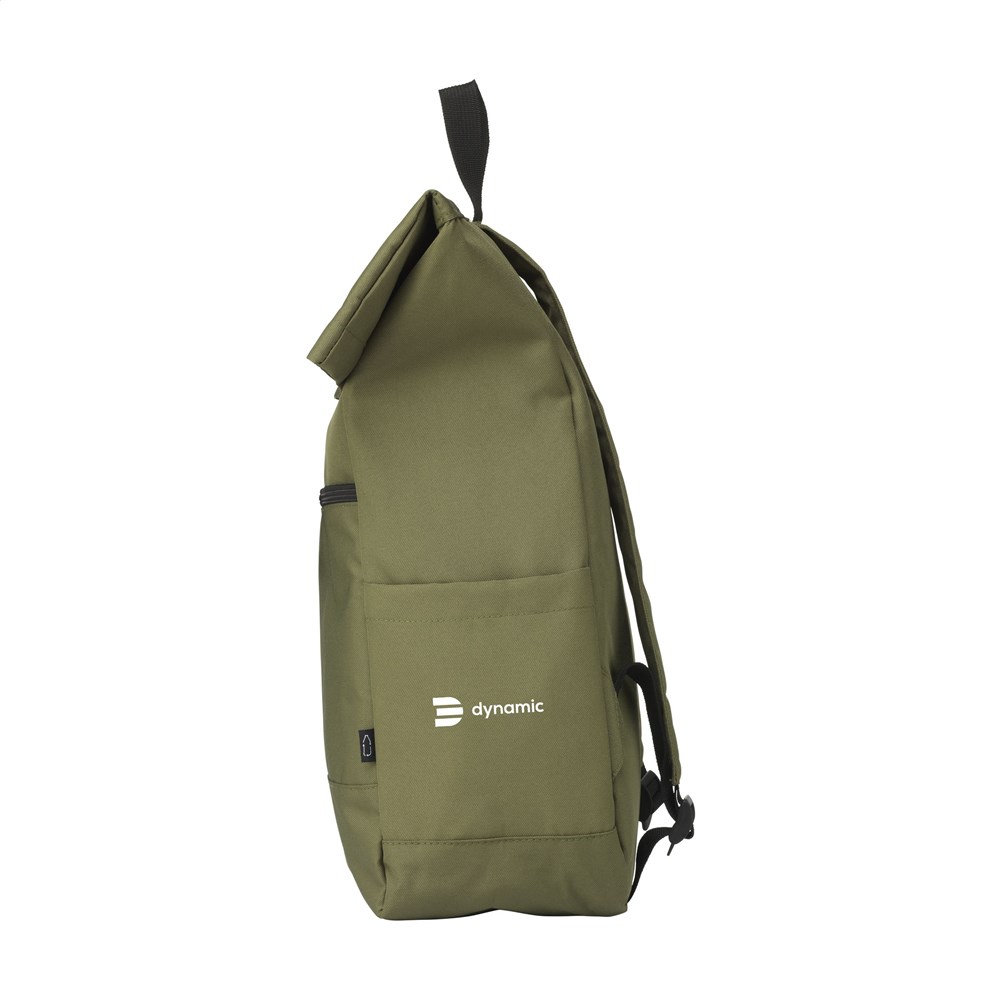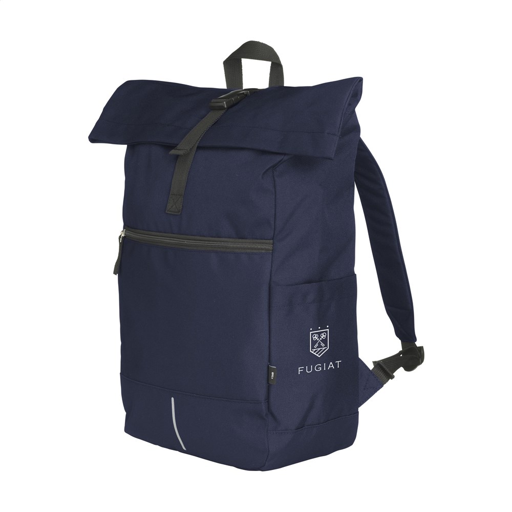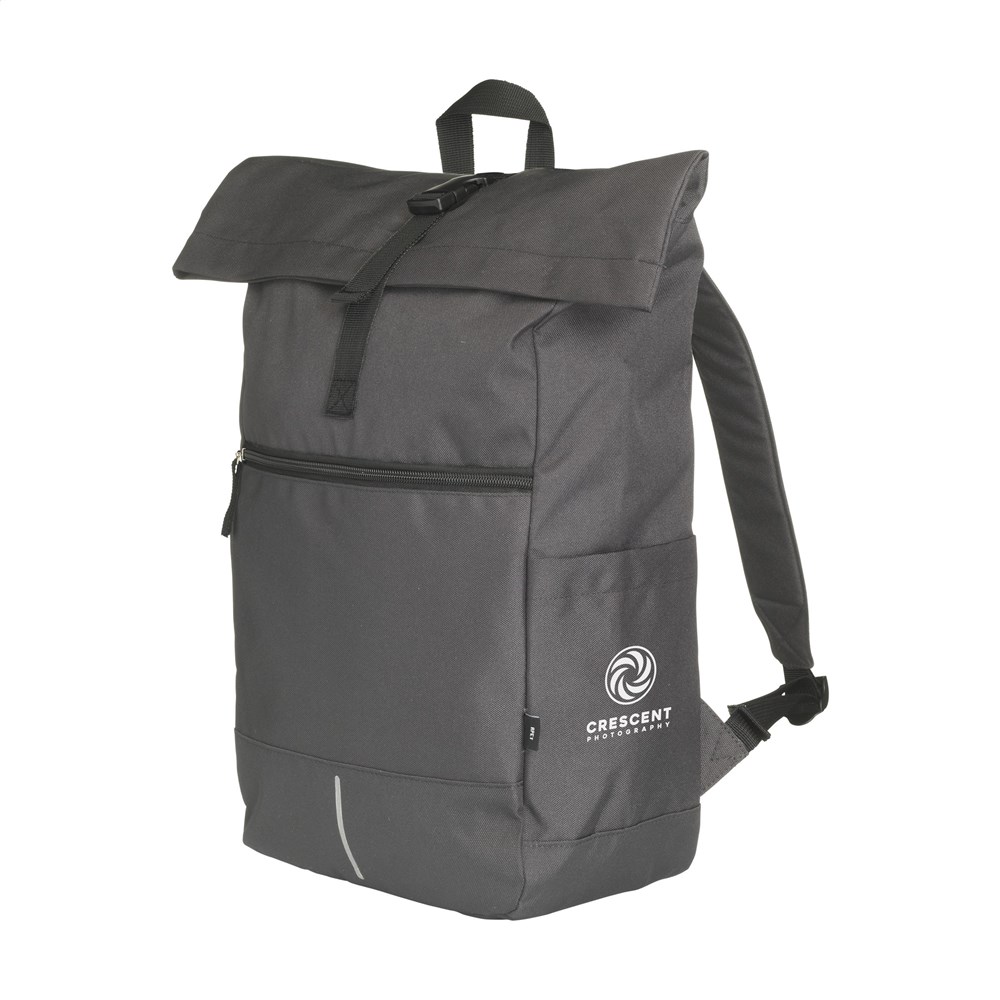 Praktische, stevige en waterafstotende ‘roll-top’ rugzak van RPET Polyester (gemaakt van gerecyclede PET-flessen). De rugzak heeft een groot binnenvak met speciaal laptopcompartiment (tot 15.4 inch). Ritsvak aan de voorzijde met daaronder een reflecterend accent (wat de zichtbaarheid in het donker verbetert). Met 2 zijvakken, foam rugzijde en gewatteerde, verstelbare schouderriemen voor meer draagcomfort, draaglus en handige rolsluiting met kliksysteem aan de bovenzijde. De perfecte tas, met een minimale ecologische footprint, voor dagelijks gebruik. Inhoud ca. 24 liter.