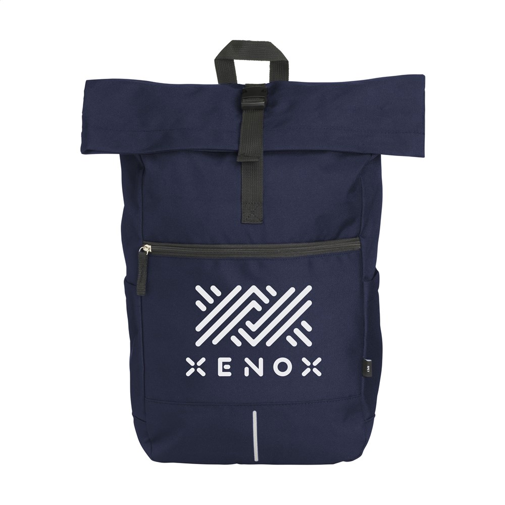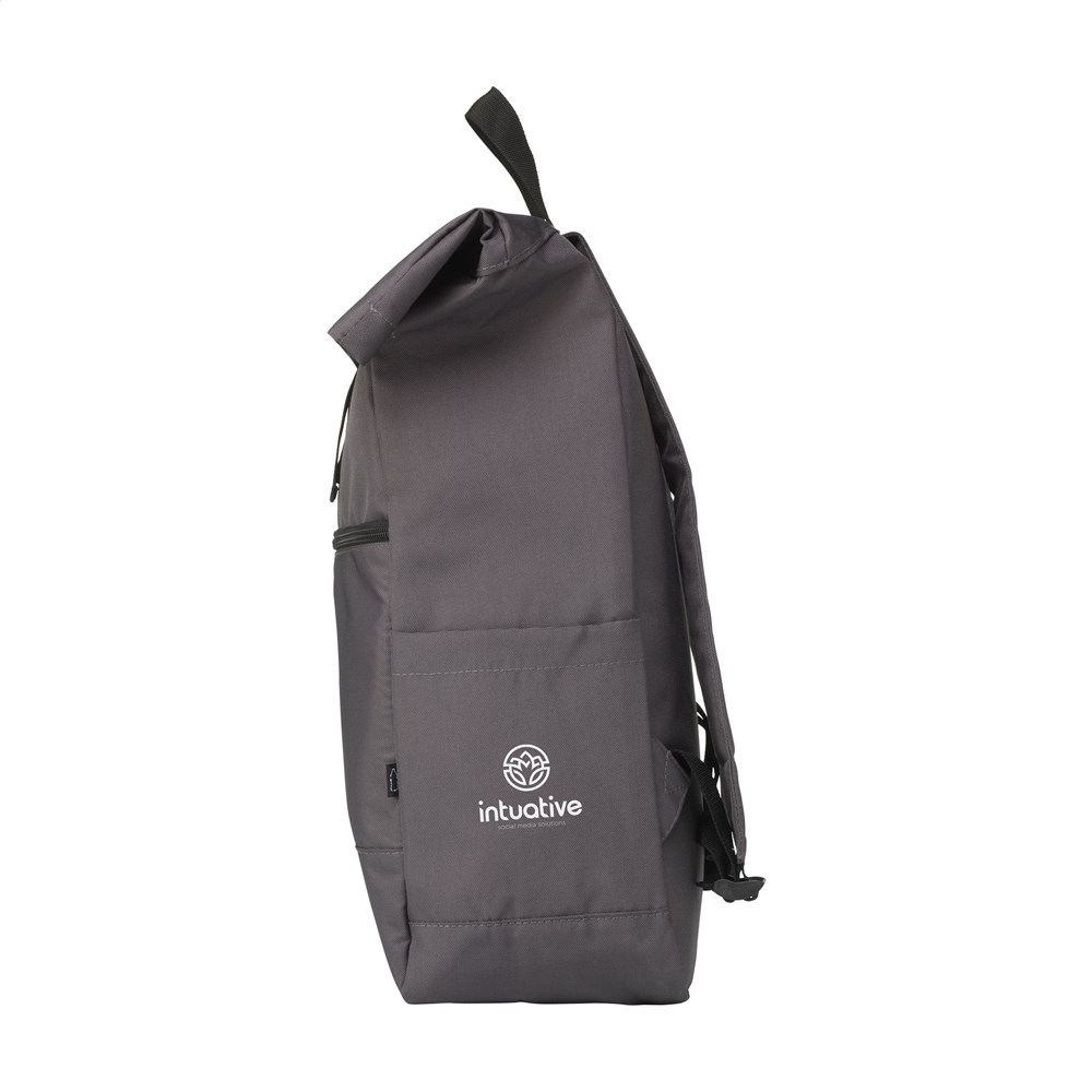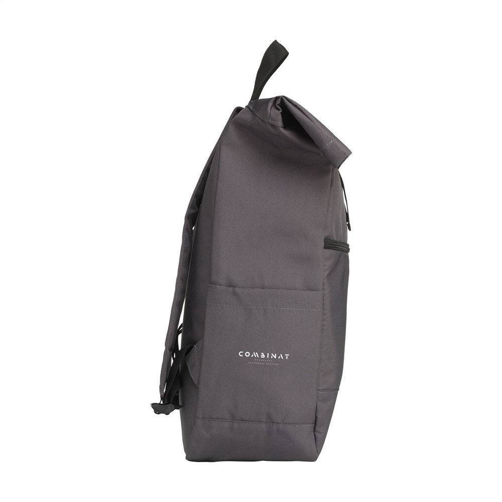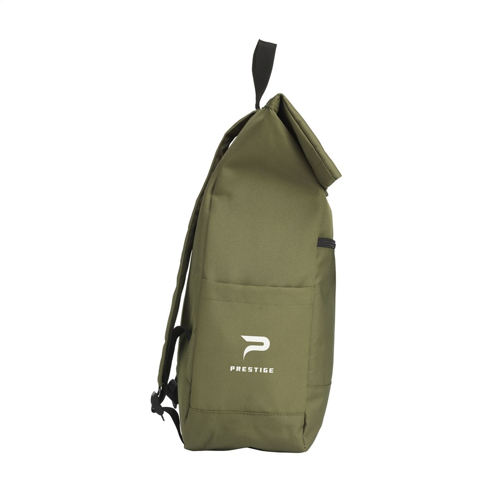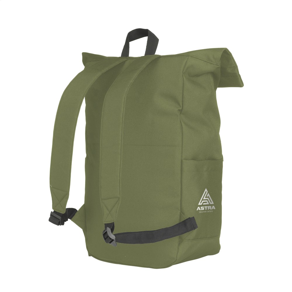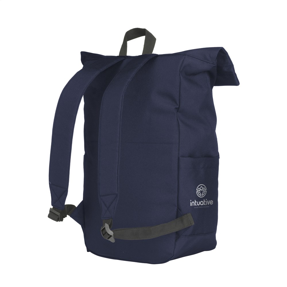 Praktische, stevige en waterafstotende ‘roll-top’ rugzak van RPET Polyester (gemaakt van gerecyclede PET-flessen). De rugzak heeft een groot binnenvak met speciaal laptopcompartiment (tot 15.4 inch). Ritsvak aan de voorzijde met daaronder een reflecterend accent (wat de zichtbaarheid in het donker verbetert). Met 2 zijvakken, foam rugzijde en gewatteerde, verstelbare schouderriemen voor meer draagcomfort, draaglus en handige rolsluiting met kliksysteem aan de bovenzijde. De perfecte tas, met een minimale ecologische footprint, voor dagelijks gebruik. Inhoud ca. 24 liter.