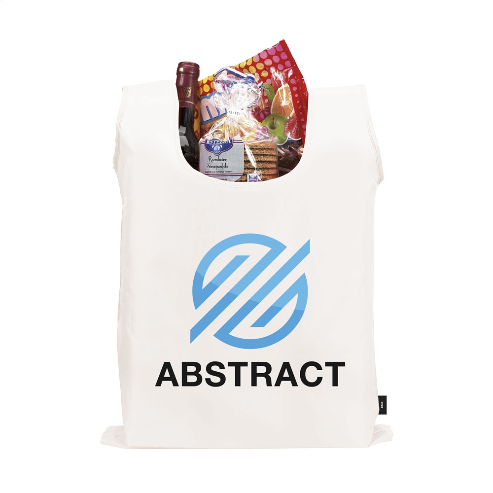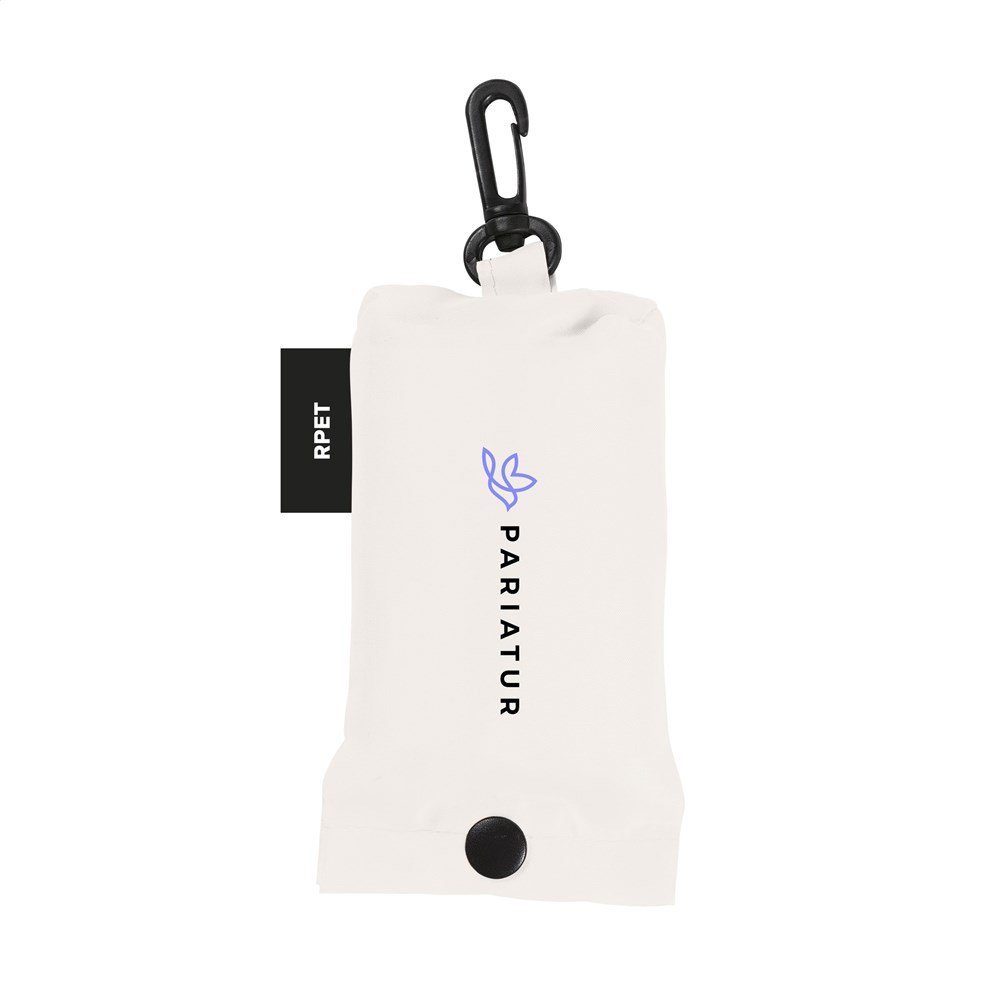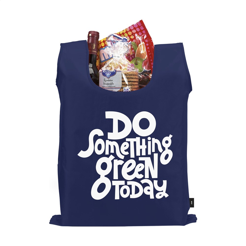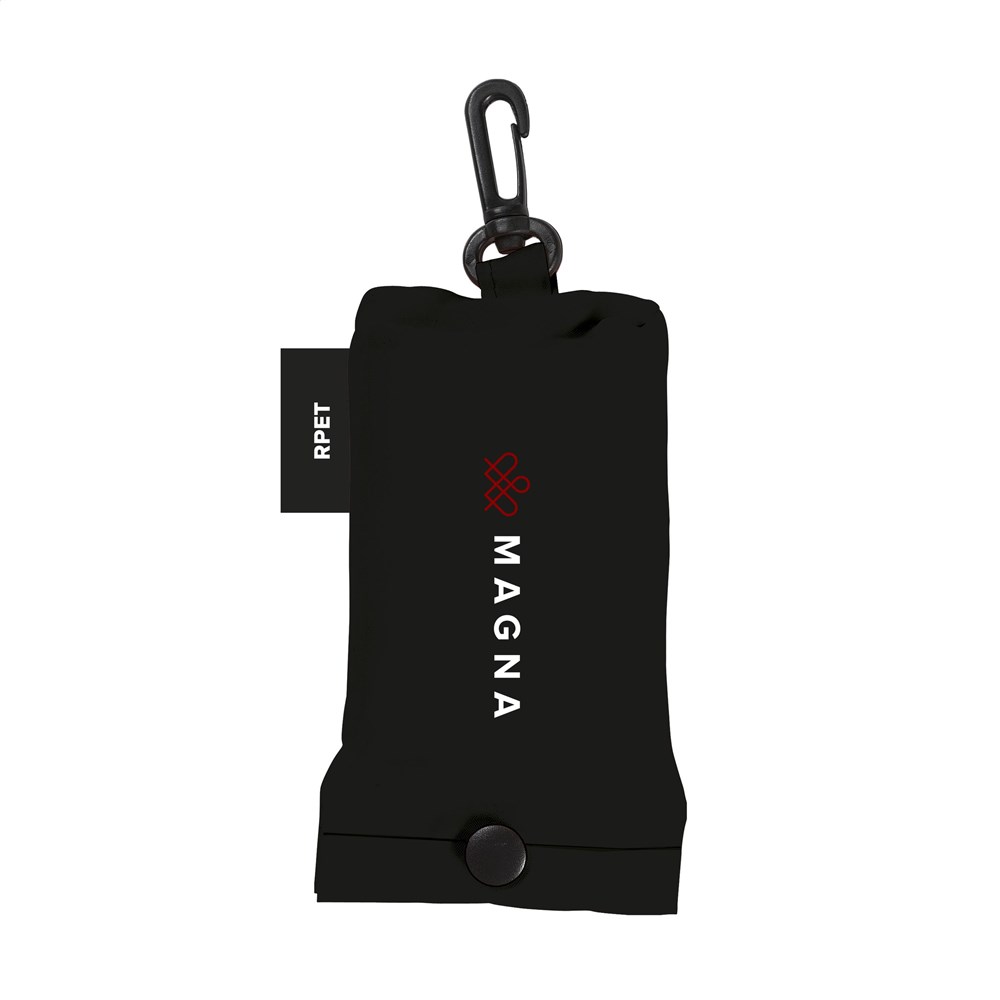 Opvouwbare winkeltas van 190T RPET polyester; gemaakt van gerecyclede PET-flessen. In etui met drukknoop en karabijnhaak. Afm. uitgevouwen 53 x 38 cm.