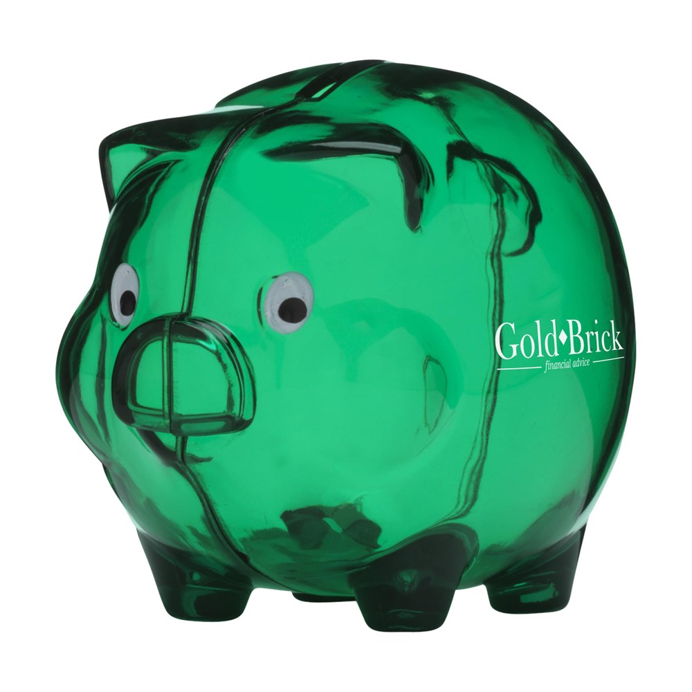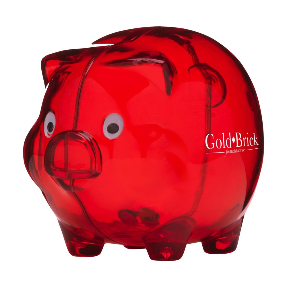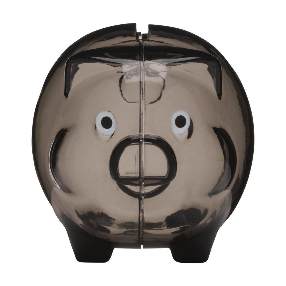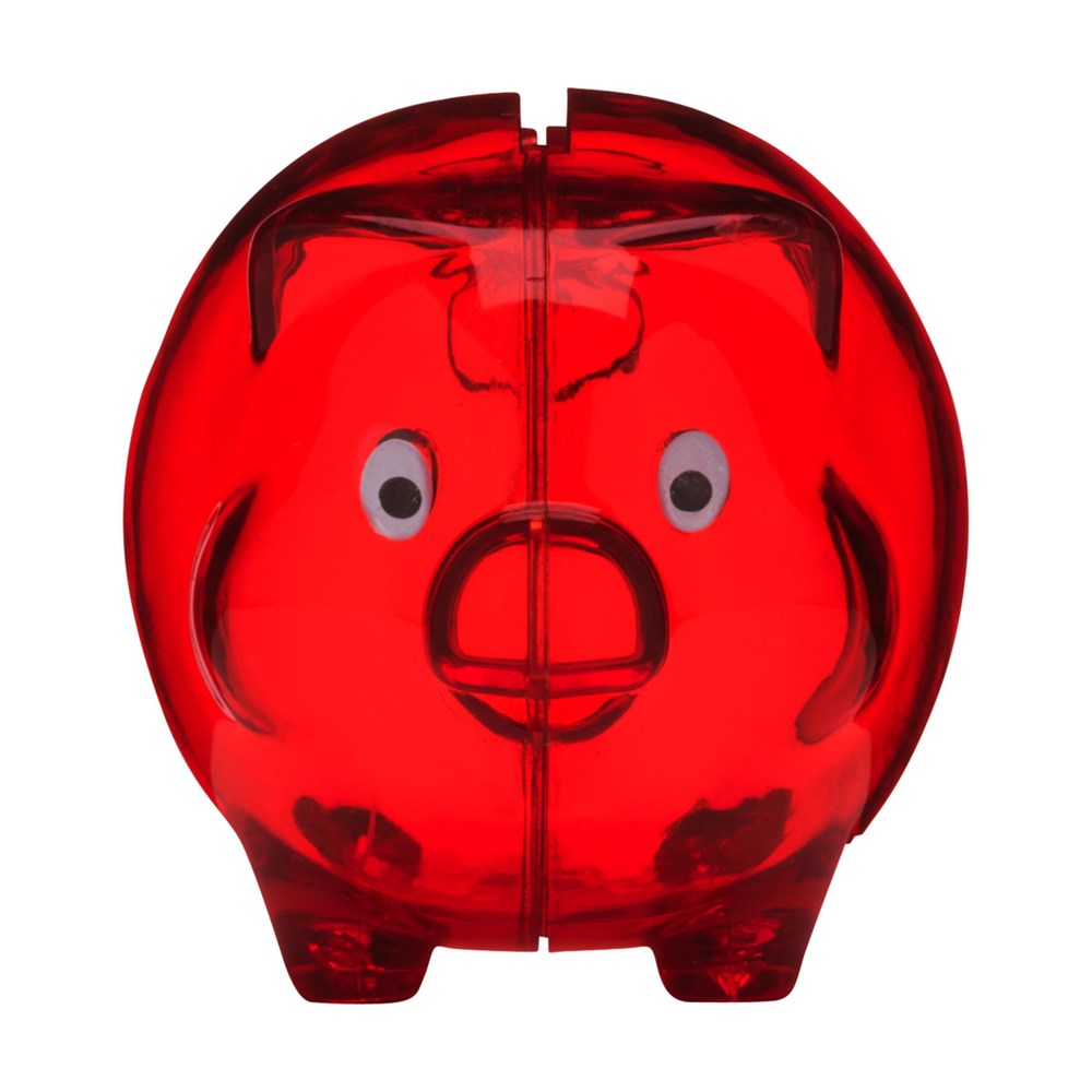 Spaarvarkentje van transparant gekleurd kunststof. Geen afsluitbare opening. Per stuk in doosje.
