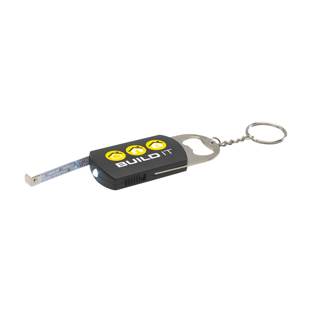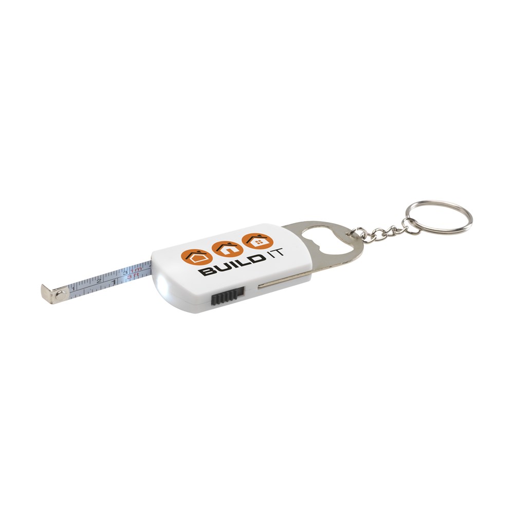 Multifunctionele sleutelhanger met stevige sleutelring, flesopener, energiezuinig LED-lampje en rolmaat met aanduiding in inches en centimeters (lengte 100 cm). Incl. celbatterijen.