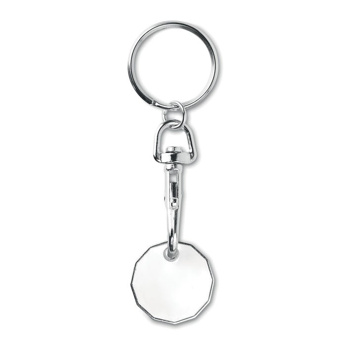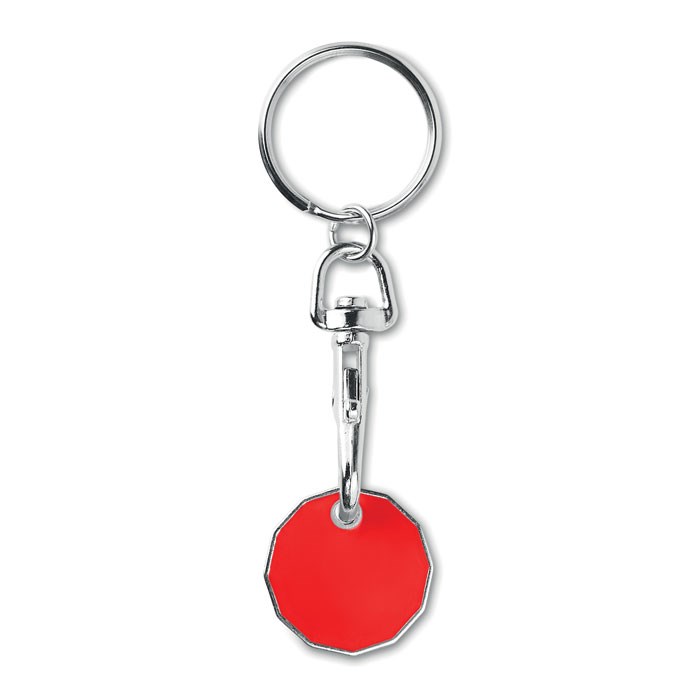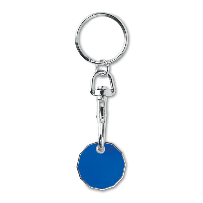 Sleutelhanger met winkelwagenmuntje GBP formaat. Metaal met email coating. Formaat Ø 23,43 mm x 2,8 mm dikte.