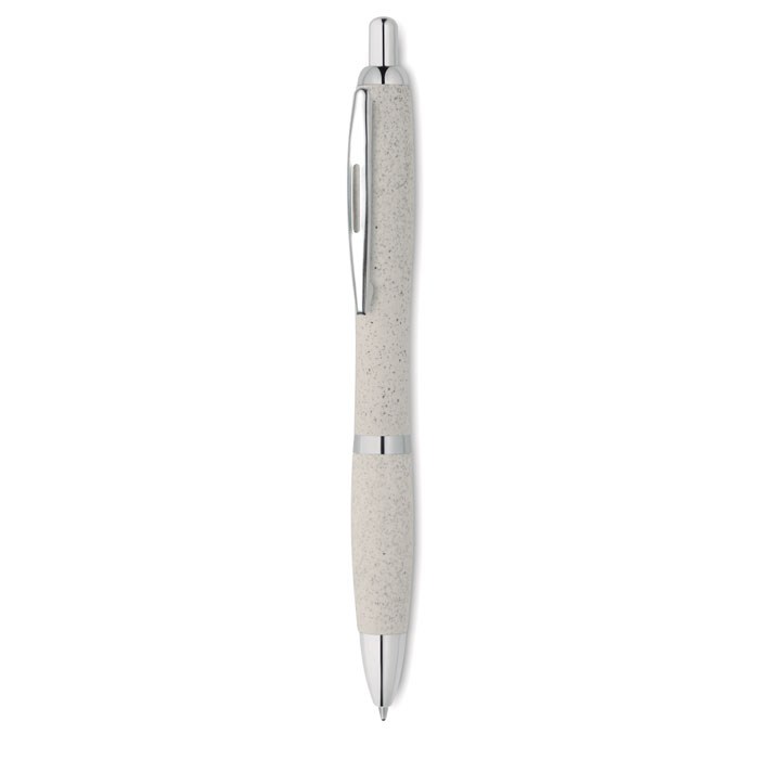 Balpen met drukmechanisme en zilveren details. Behuizing is van 50% tarwestro en 50% ABS-materiaal. Blauwe inkt.