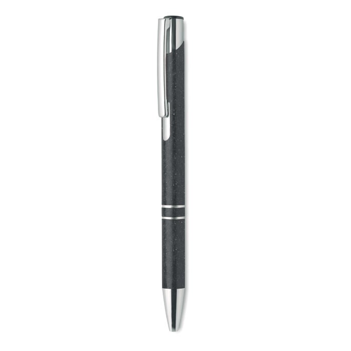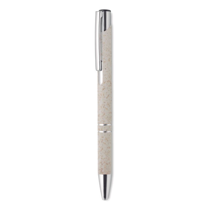 Balpen met drukmechanisme en zilveren details. Behuizing is van 50% tarwestro en 50% ABS-materiaal. Blauwe inkt.