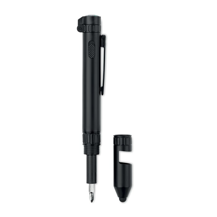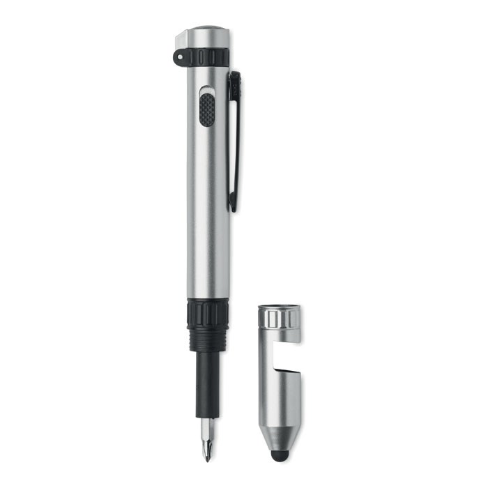 Multifunctionele stylus pen met wit LED licht, schroevendraaier, telefoonstandaard en decoratief kompas van ABS met matte finish.