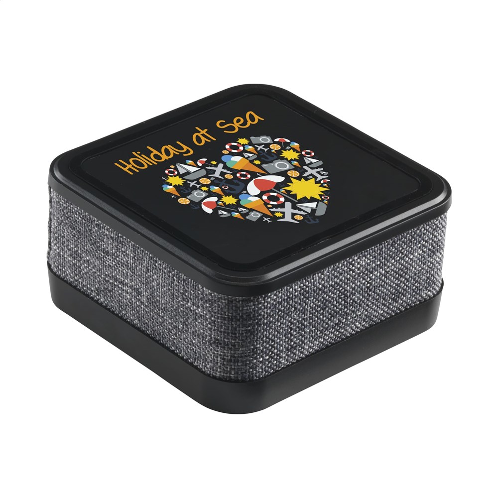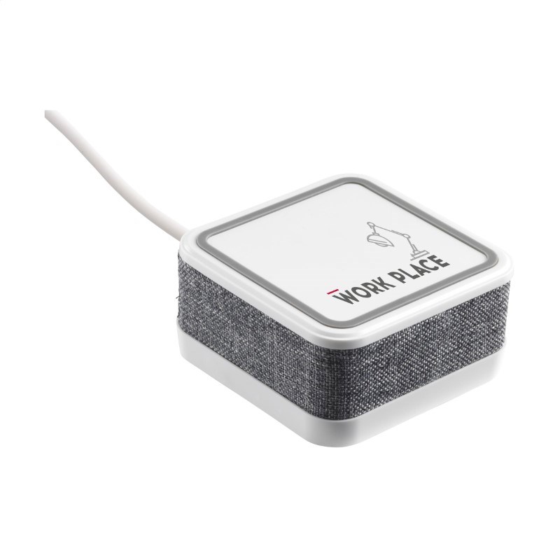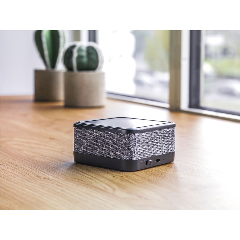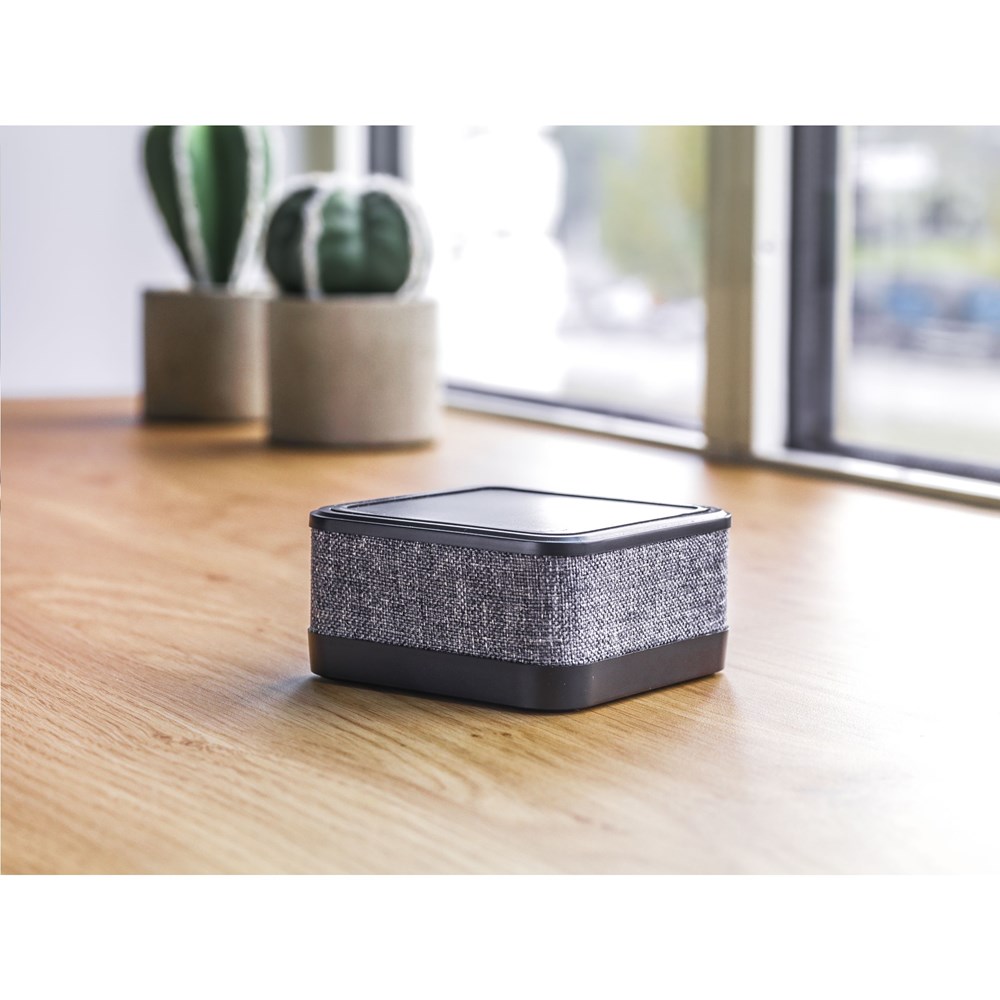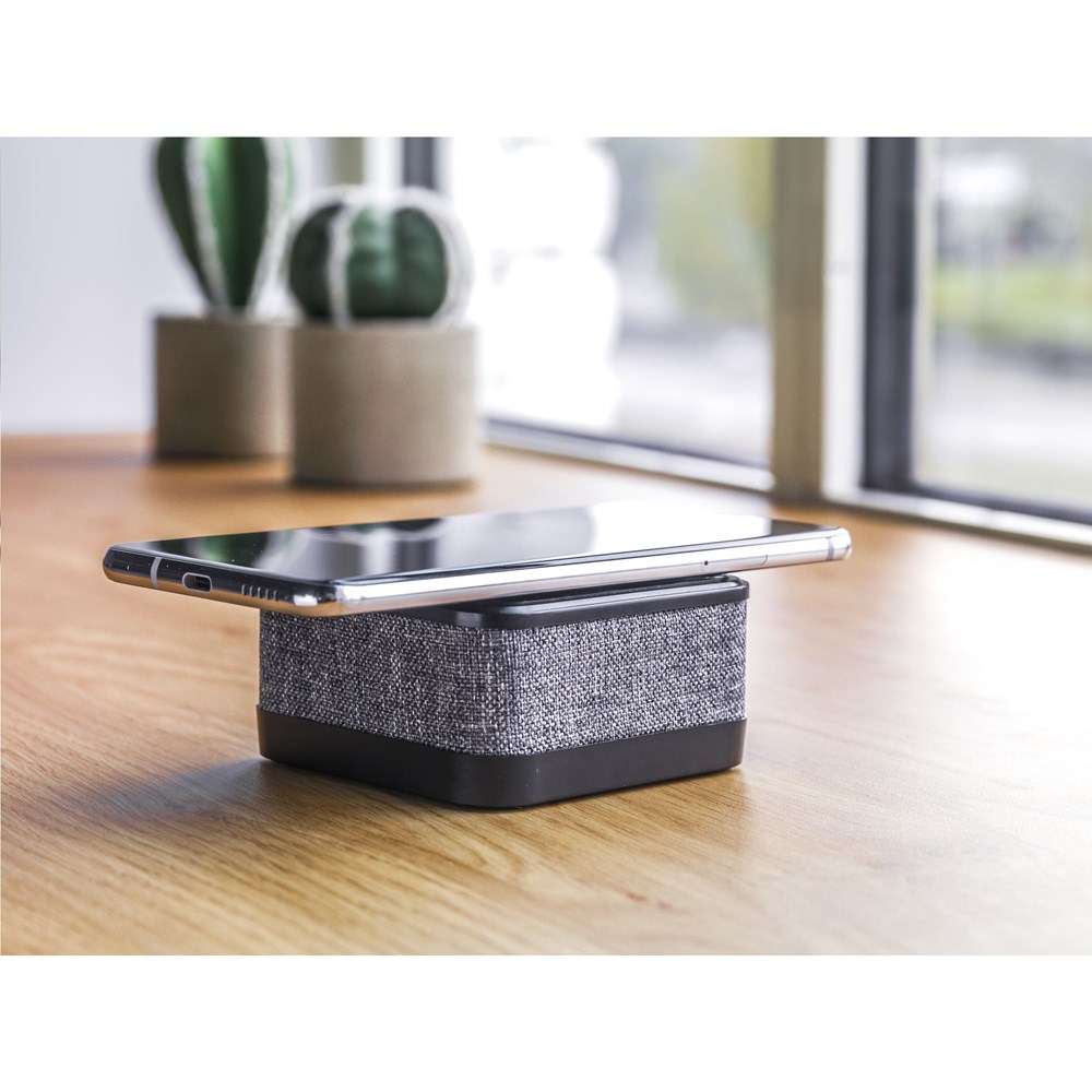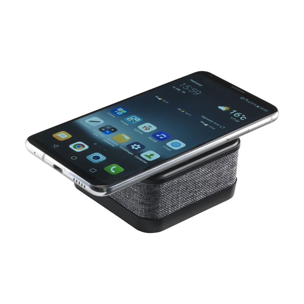 Stijlvolle bluetooth speaker én draadloze oplader inéén, van ABS/Textiel. De ideale combinatie voor laden en luisteren. De draadloze 3W bluetooth speaker (versie 4.1) is oplaadbaar en beschikt over uitstekende geluidsweergave. Frequentie: 20HZ-20KHz. Met ingebouwde 400mAh li-ion batterij voor lang luisterplezier. De 5W draadloze oplader is compatibel met apparaten die Qi draadloos opladen ondersteunen (nieuwste generatie Androids en iphones vanaf model 8). Input: 5V/1A. Wireless output: 5V/0.8A. Inclusief micro-USB kabel en gebruiksaanwijzing. Per stuk in doosje.