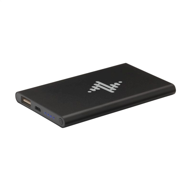 Compacte, duurzame en hoogwaardig afgewerkte aluminium powerbank met ingebouwde lithiumpolymeer batterij (4000mAh). Input 5V/1A. Output: 5V/1A. Inclusief 50 cm lange micro-USB (1A) oplaadkabel, indicator lampjes, aan/uit knop en gebruiksaanwijzing. Per stuk in doos.