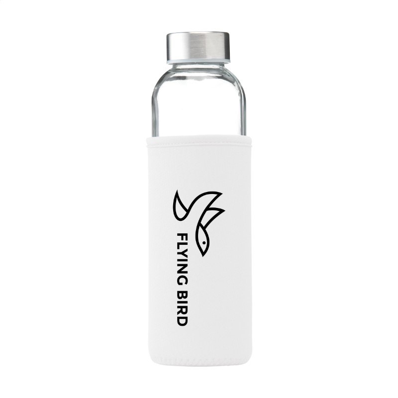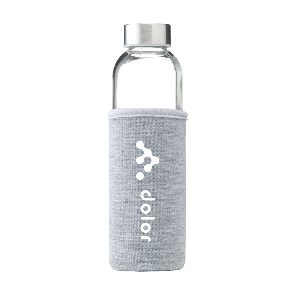 Slanke, milieuvriendelijke en lekvrije waterfles van duurzaam sodalime-glas met RVS schroefdop. Met neopreen sleeve voor het comfortabel dragen van de fles. Inhoud 500 ml. Per stuk in doos.