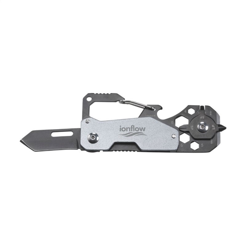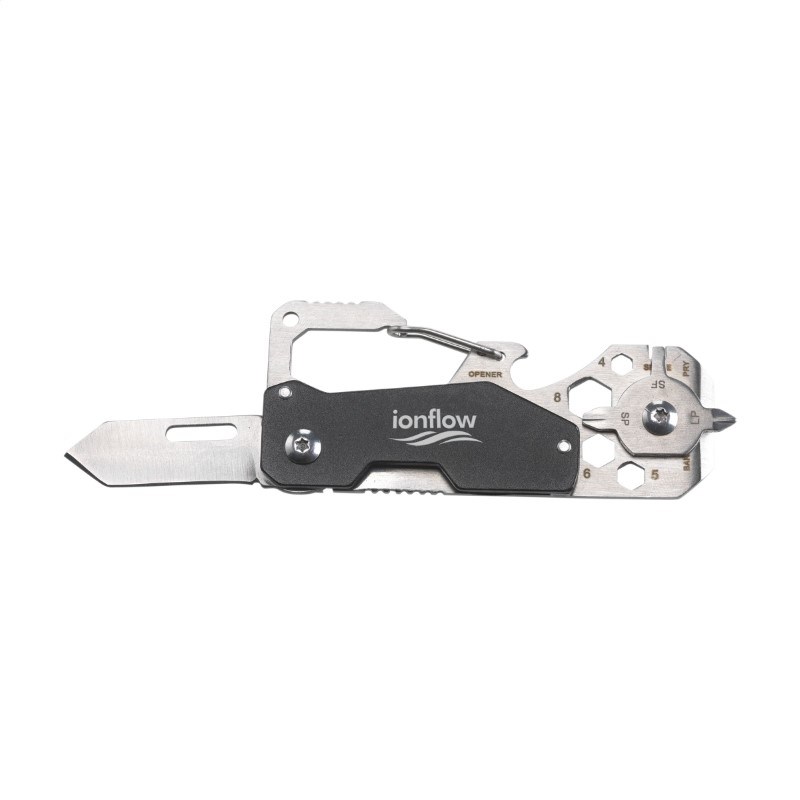 RVS multitool in handig pocketformaat. Met metallic look accent en 8 functies: spaaksleutel, flesopener, karabijnhaak, philips schroevendraaier, moersleutels, mes, liniaal en koevoet. Op het bezit en/of dragen van messen of multitools in het openbaar kunnen lokale regels van toepassing zijn.