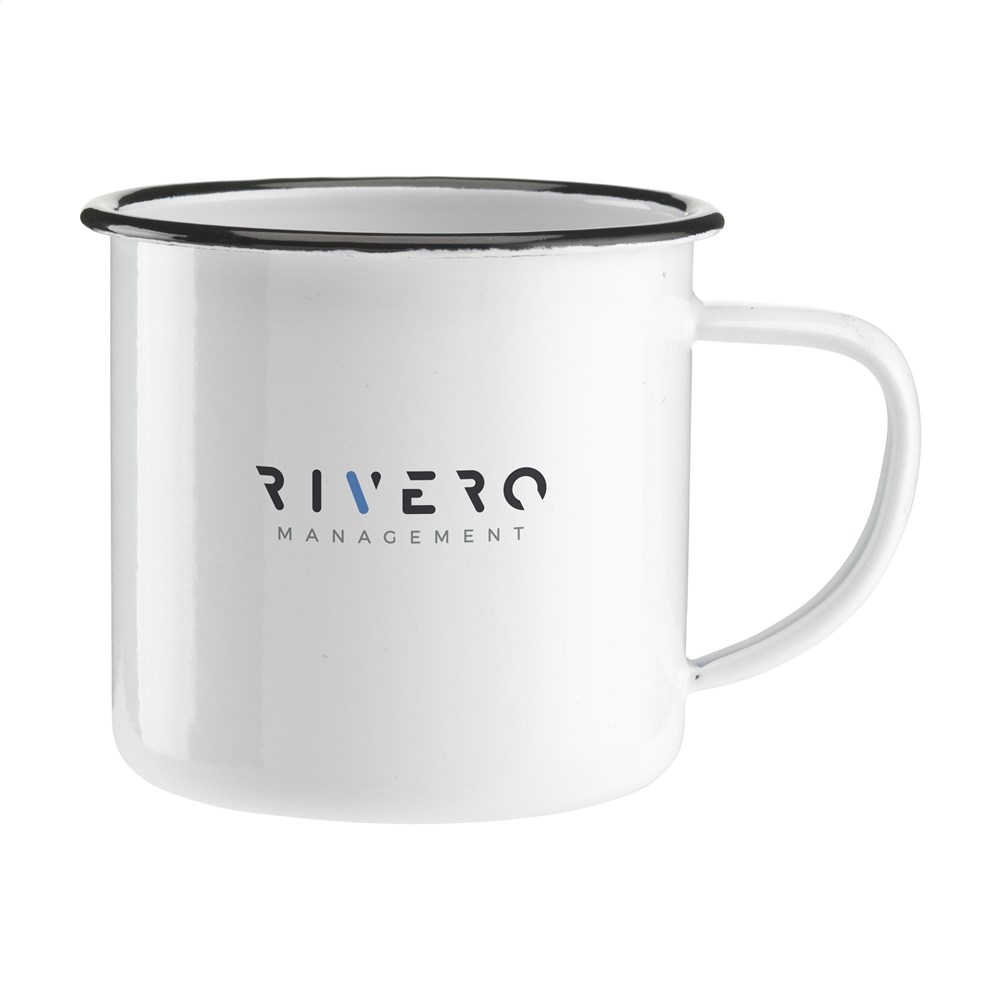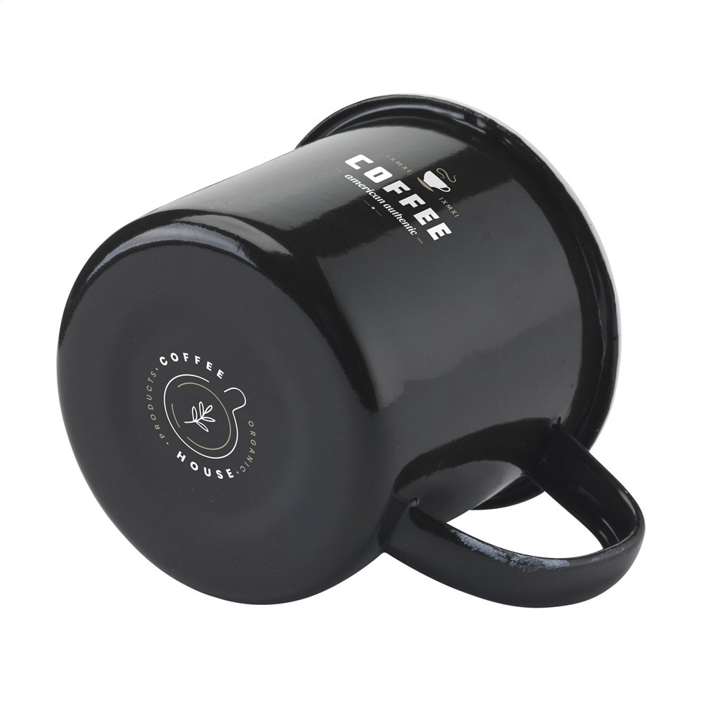 Geëmailleerde mok. Een ontwerp in populaire retrostijl. Om de retro look te accentueren heeft de mok onvolkomenheden. Niet vaatwasserbestendig. Inhoud 350 ml. Per stuk in doos.