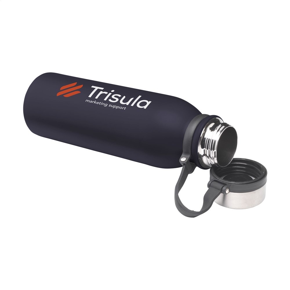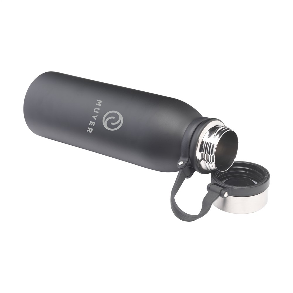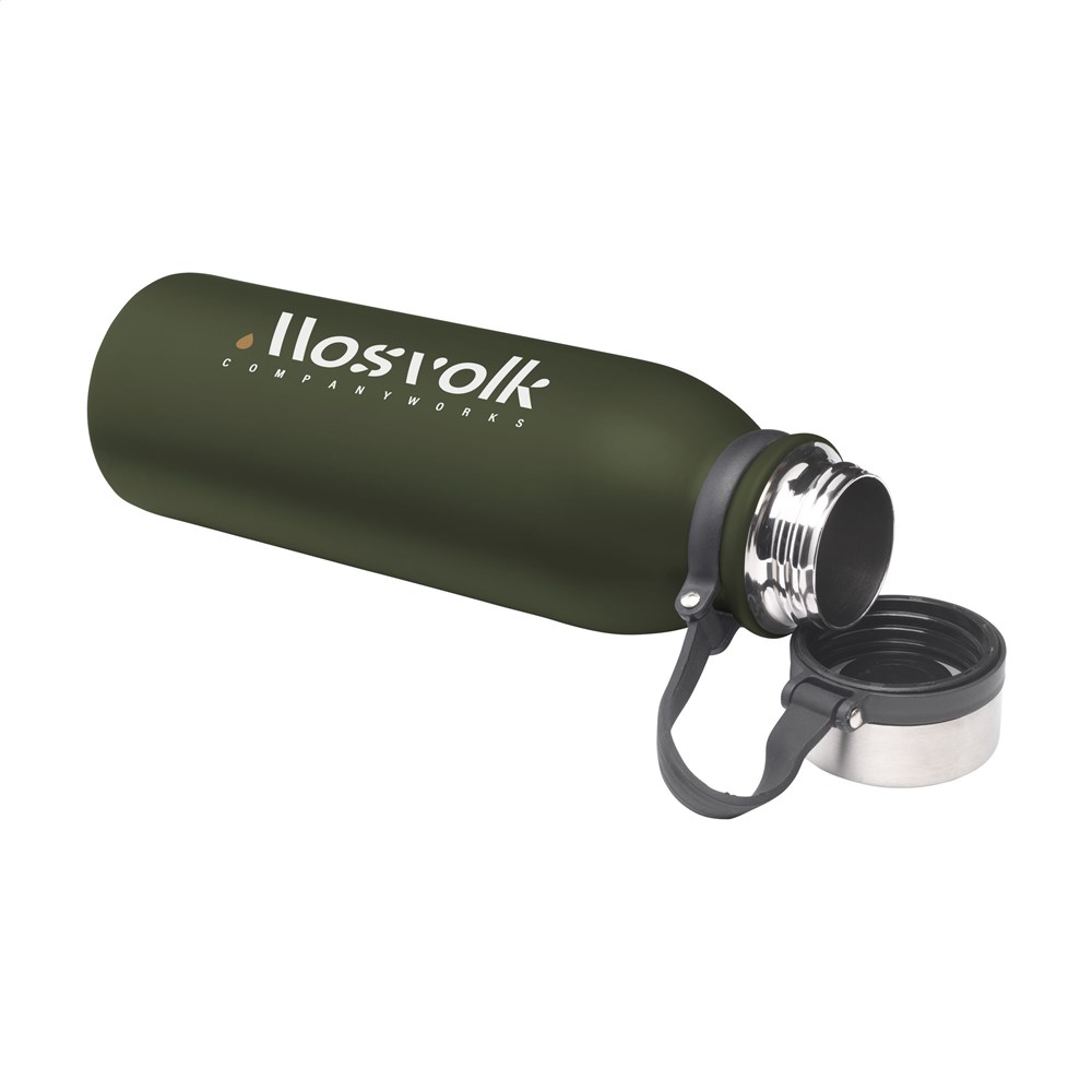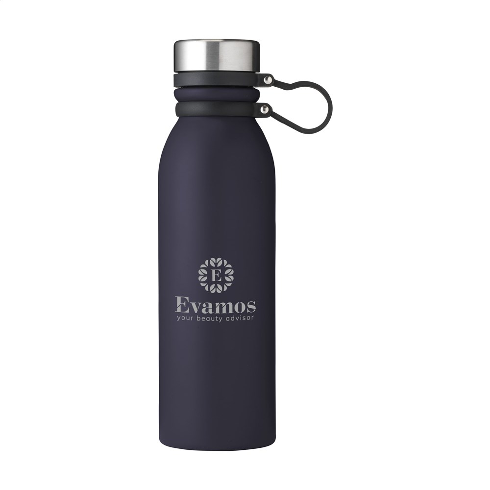 Dubbelwandige, vacuüm geïsoleerde, lekvrije RVS waterfles/thermosfles. De schroefdop is bevestigd aan een draaibare siliconen draaglus en blijft hangen als de fles geopend is. Zo heb je altijd een hand vrij. Geschikt voor het op temperatuur houden van koude of warme dranken. Inhoud 600 ml. Per stuk in doos.