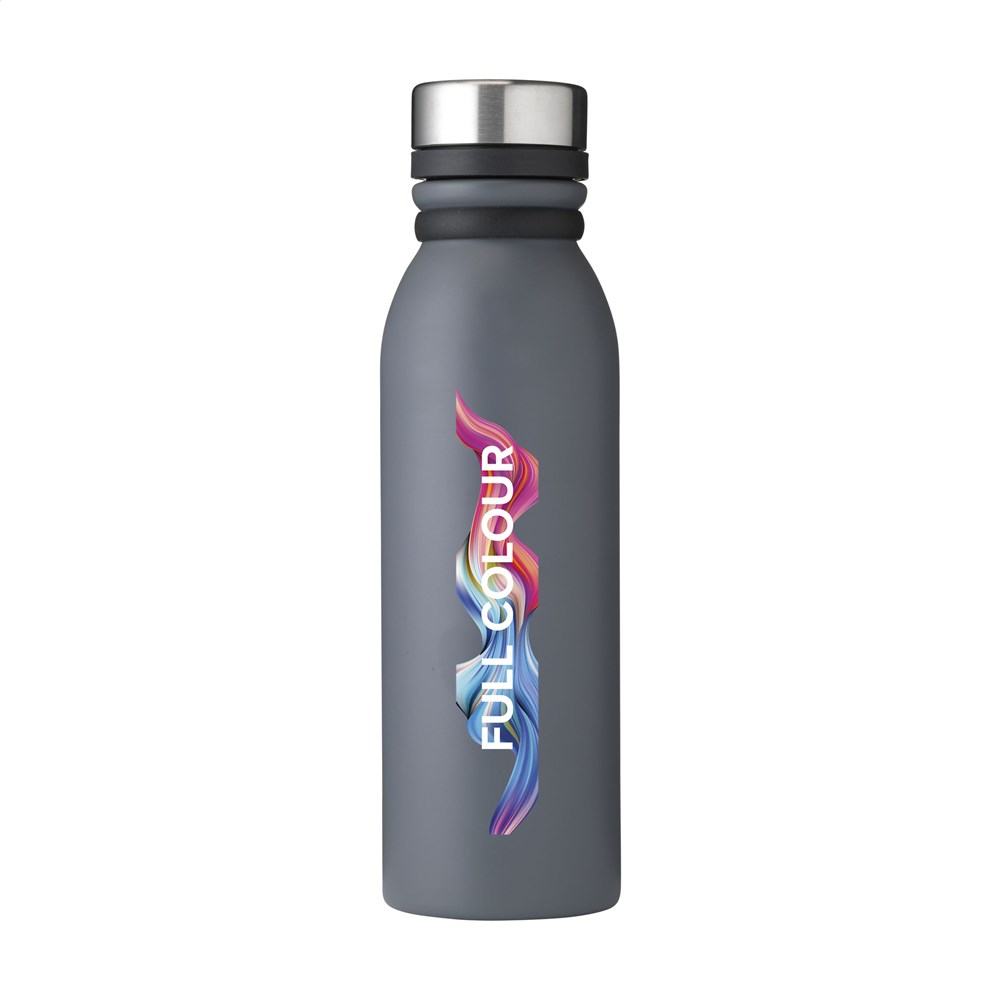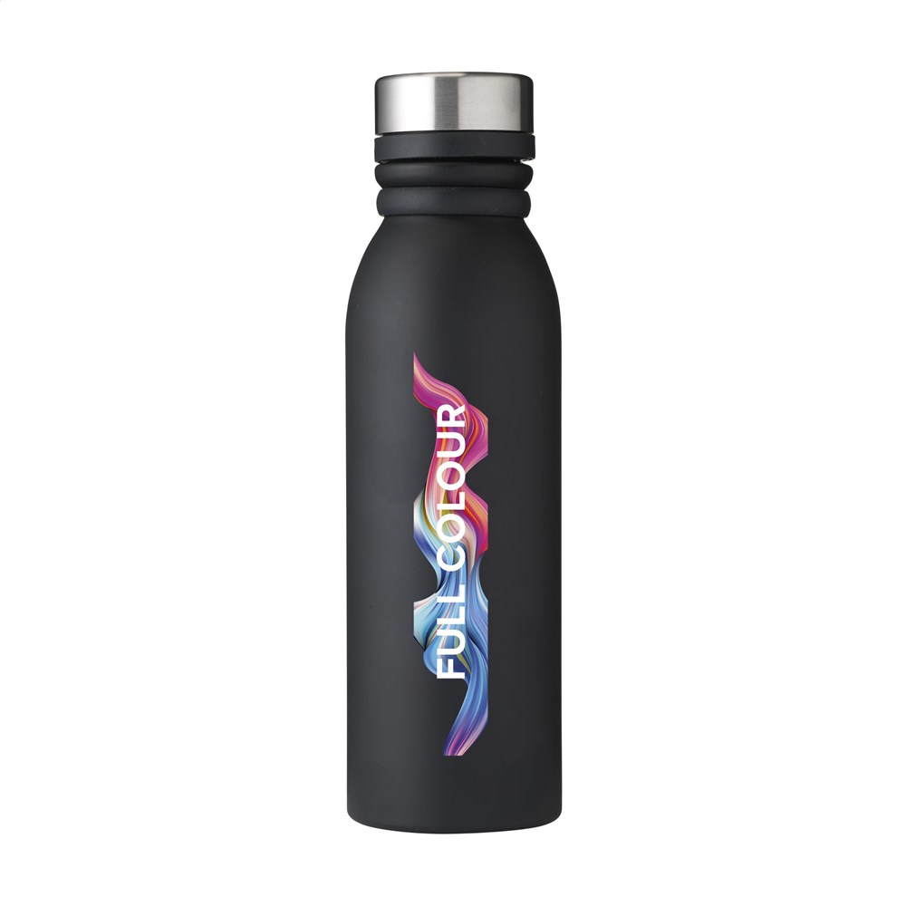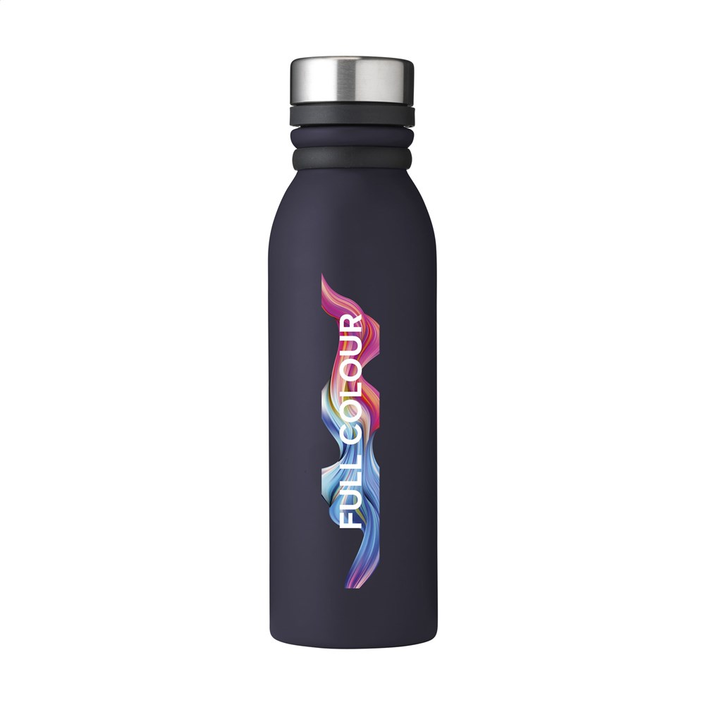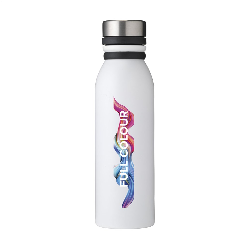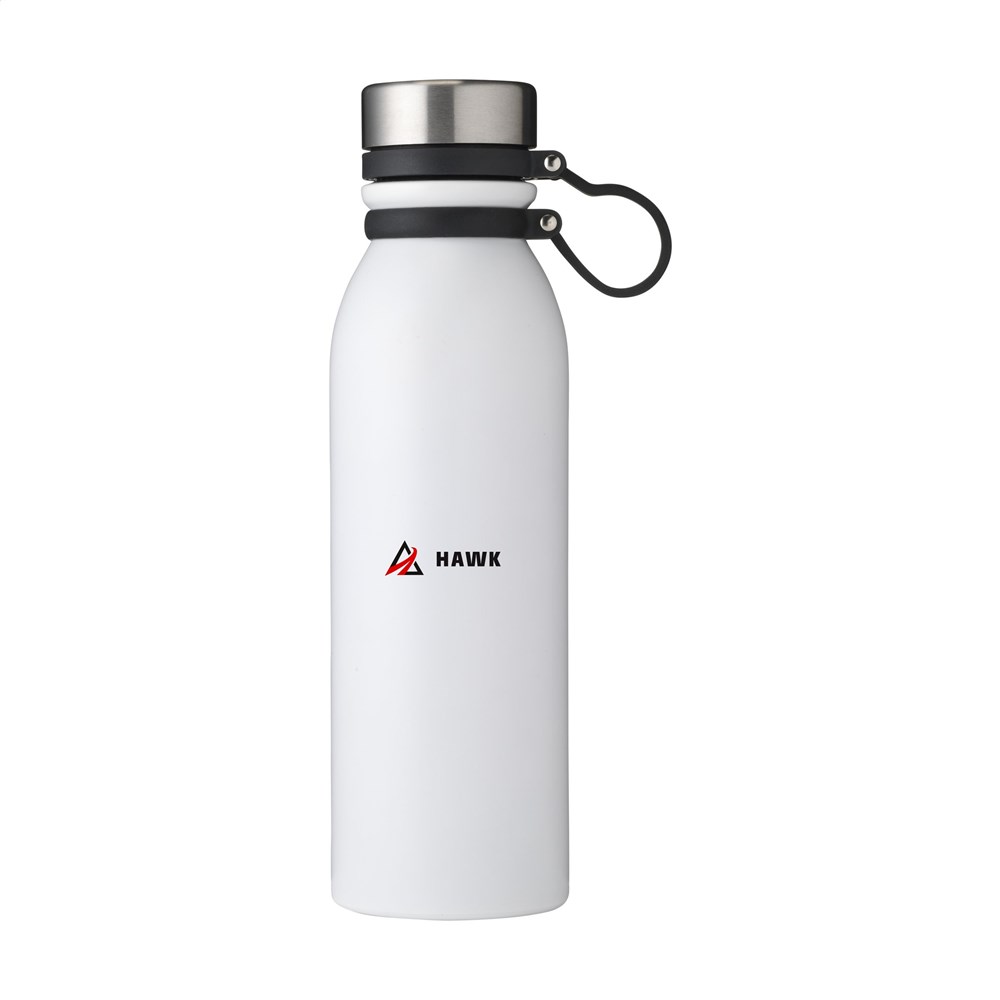 Dubbelwandige, vacuüm geïsoleerde, lekvrije RVS waterfles/thermosfles. De schroefdop is bevestigd aan een draaibare siliconen draaglus en blijft hangen als de fles geopend is. Zo heb je altijd een hand vrij. Geschikt voor het op temperatuur houden van koude of warme dranken. Inhoud 600 ml. Per stuk in doos.