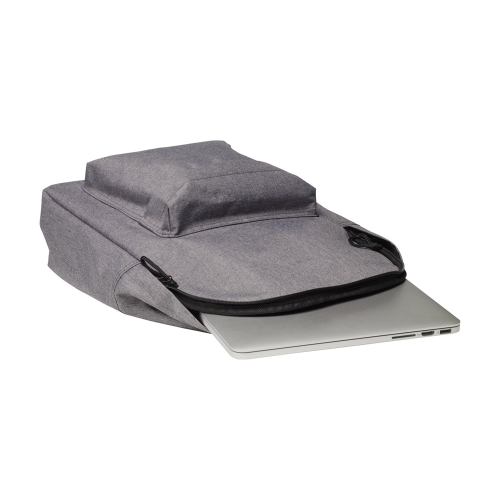 Stoere heather grey rugzak met een ruim hoofdvak voorzien van een foam beschermvak voor een tablet tot 15.4". De rugzak heeft een voorvak met rits, een gewatteerde rugzijde, een verstelbare, gewatteerde schouderriemen en een draaglus. De binnenzijde is voorzien van een waterbestendige coating.