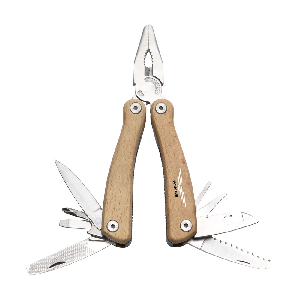 Compacte RVS multitang met beukenhouten handgreep. 9-delig met 11 functies: tang, mes, vijl, kruiskopschroevendraaier, 2 schroevendraaiers, draadknipper, priem, bllikopener, flesopener en zaag. In etui met riemlus. Op het bezit en/of dragen van messen of multitools in het openbaar kunnen lokale regels van toepassing zijn. Per stuk in doosje.