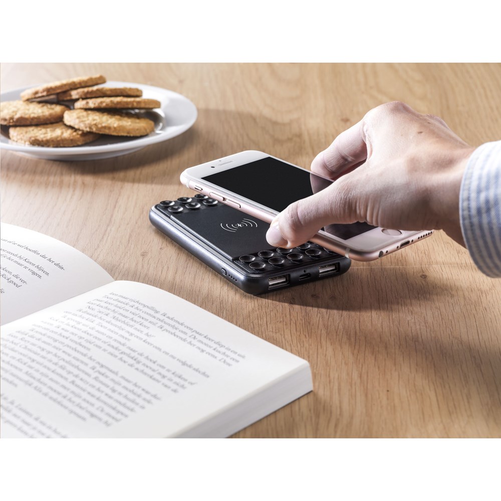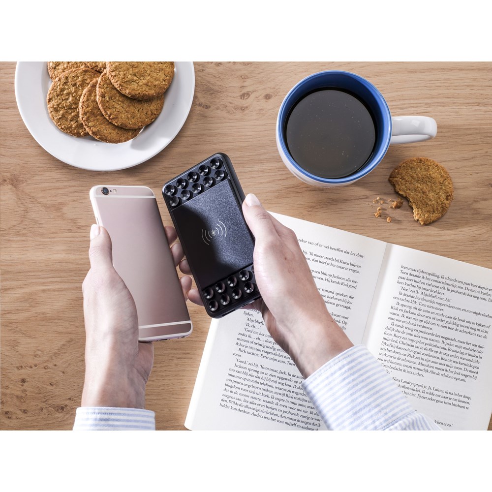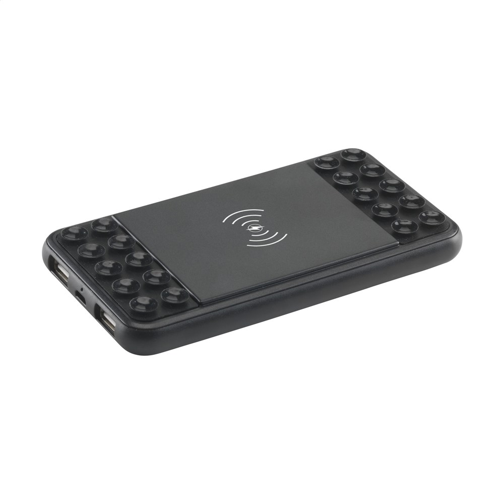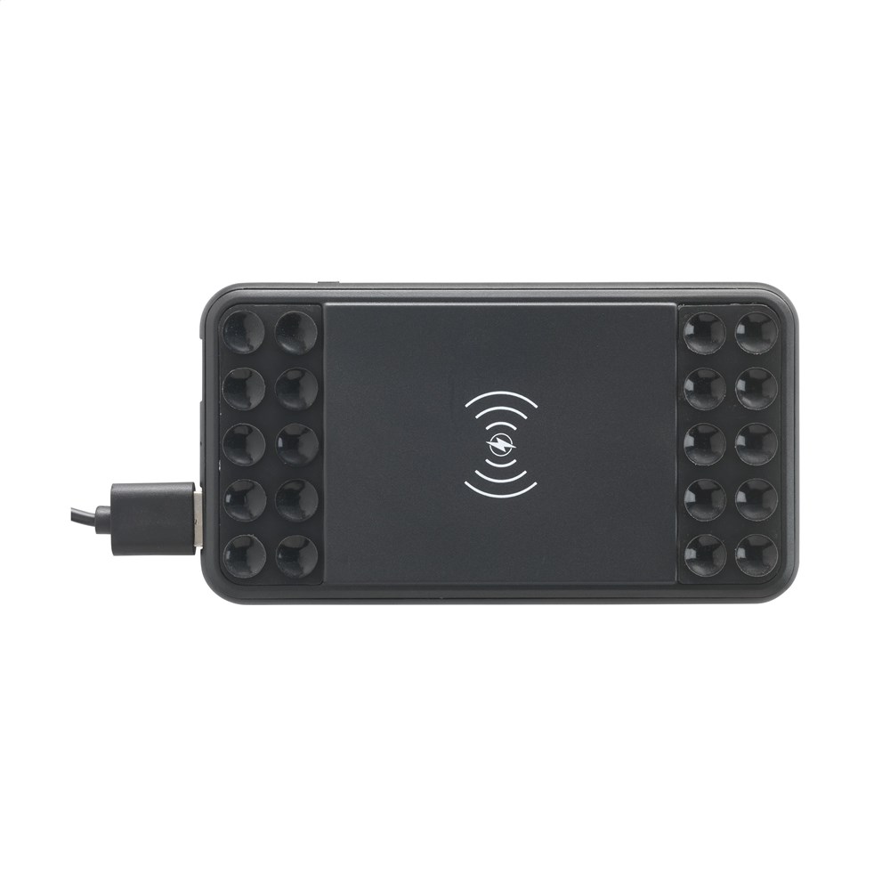 ABS wireless charging powerbank met ingebouwde polymer batterij (4000mAh). Deze alleskunner met handige zuignappen, aan/uit knop en indicatielampjes, laadt smartphones snel via kabel en beschikt over een geïntegreerde 5W wireless laadfunctionaliteit voor het draadloos opladen van mobiele apparaten die QI draadloos laden ondersteunen (nieuwste generatie Android en iPhones). Input: DC5V/1.5A. Output USB: DC5V/2.1A. Wireless output: DC5V/0.8A. Inclusief micro-usb oplaadkabel en gebruiksaanwijzing. Per stuk in doosje.