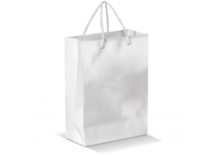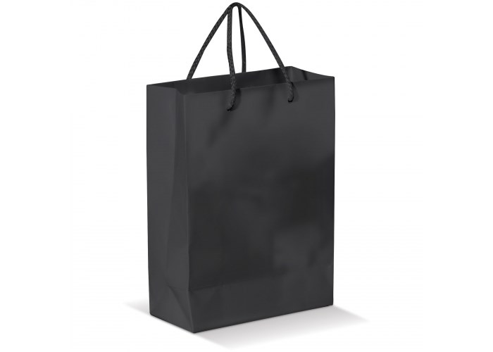 Kleine papieren tas met hengels van gevlochten touw in wit en zwart. Stevig en geschikt voor kleine artikelen. Glossy gelamineerd.