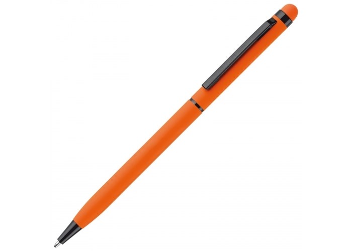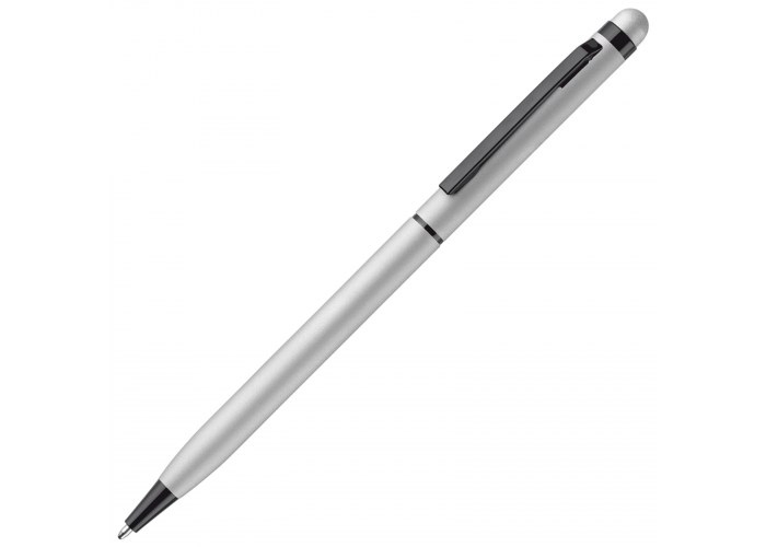 Moderne slanke aluminium balpen met stylusfunctie. De balpen heeft een rubberised soft touch afwerking en is voorzien van zwarte clip, ring en punt. Pen is voorzien van draaimechanisme.