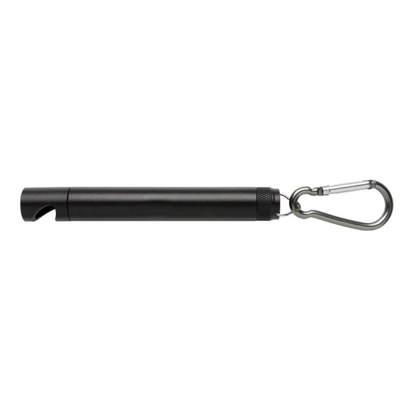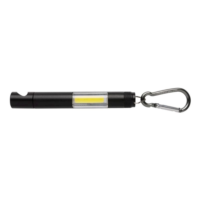 1W ultra-heldere aluminium COB zaklamp met flesopener op de rug. Inclusief karabijnhaak om het licht aan uw tas of een ander object te bevestigen. Inclusief batterijen.