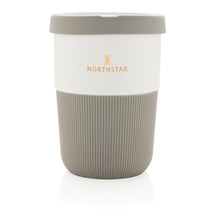 Een duurzaam alternatief voor traditionele bekers! Deze PLA-koffiekop is stijlvol en praktisch in de ochtend en is ideaal voor het vervoeren van uw favoriete warme drank. Vervaardigd uit plantaardig materiaal (PLA), dus niet alleen stijlvol maar ook vriendelijk voor de planeet. Wordt geleverd met een siliconen grip en deksel voor uw gemak. 100% melamine vrij. Capaciteit 380 ml.