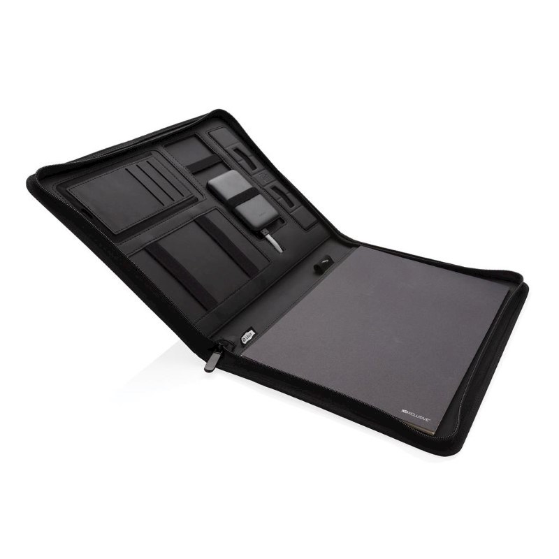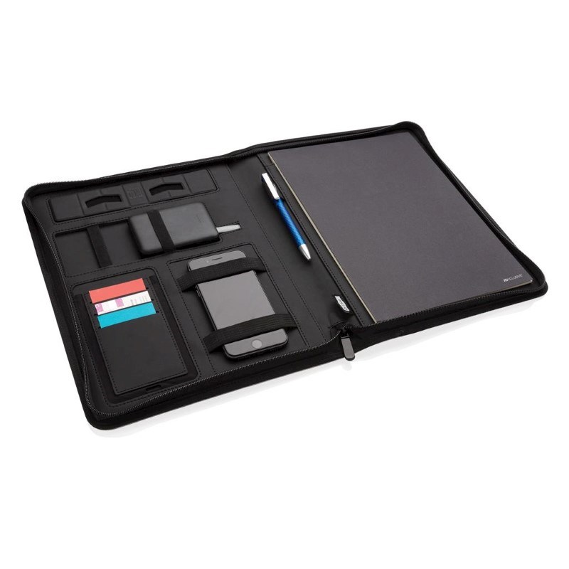 Deze RPET-portfolio met een notitieblok van 20 gelinieerde 70 grams creme-kleurige pagina's beschikt over de nieuwste technologie. De voorkant heeft een draadloos oplaadpad voor je telefoon. (Nieuwste generaties Android, iPhone 8 en hoger). Oudere telefoons en tablets kunnen worden opgeladen via de USB-poorten van de 5.000 mAh powerbank. Input: 5.0V/2.1A. Uitgang 1: 5.0V/2.1A. Uitgang 2: 5.0V/2.1A. Draadloze uitgang: 5W. Geregistreerd ontwerp®