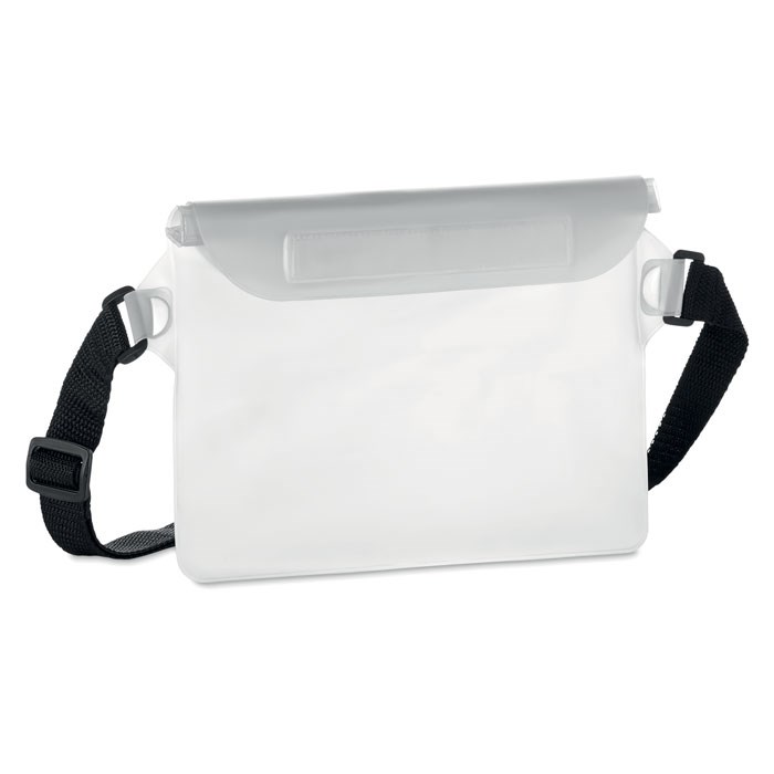 Waterproof heuptas van frosted PVC. Doordat het oppervlak wat dunner is kun je een smartphone door de tas heen bedienen.