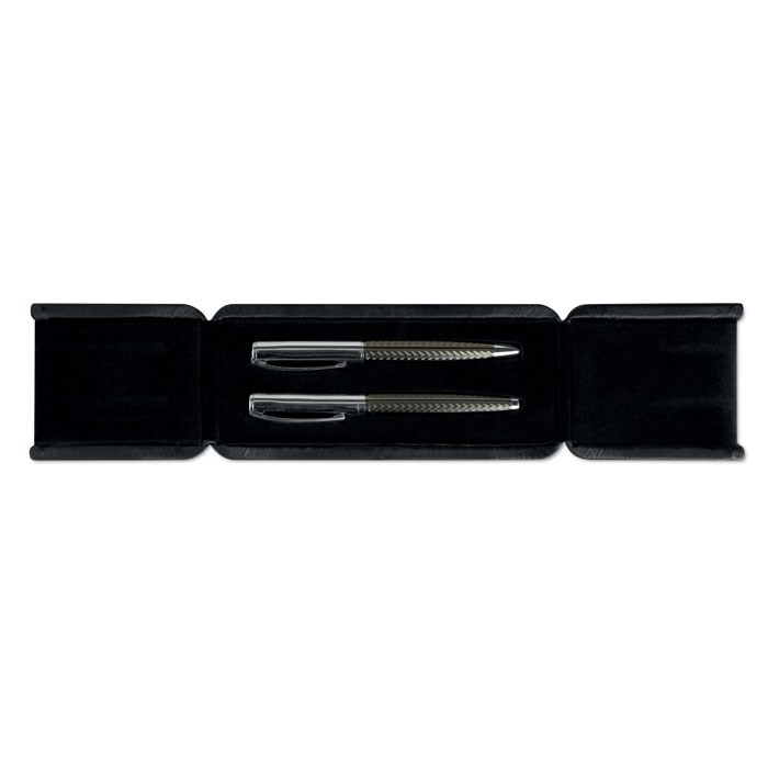 Pennenset in een geschenkverpakking bestaande uit een messing balpen met draaimechanisme en een roller pen. Blauwe inkt.
