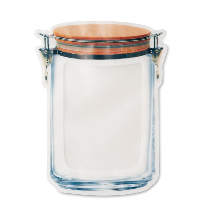Grote eco-vriendelijke, herbruikbare en lekvrij sta-zak voor voedsel met weckpot-print. Geschikt voor koud (-10˚C) en warm (50˚C). Materiaal: PET (0,13 mm)/ MOP met PE ziplock sluiting. BPA-vrij.