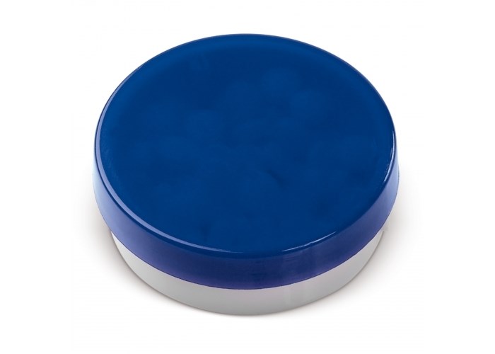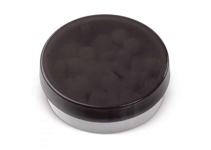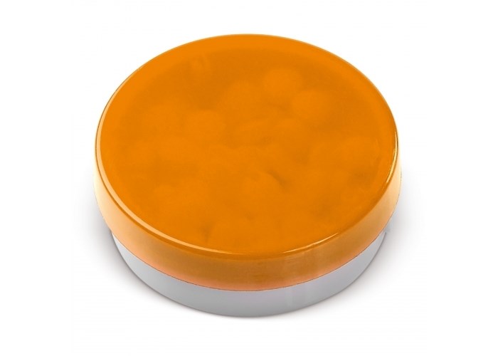 Ronde pepermuntdoos in aantrekkelijke kleurcombinaties en met een transparante deksel. De mintjes komen er aan de zijkant uit middels druk opening. Bevat 9,5 gram suikervrije mintjes.