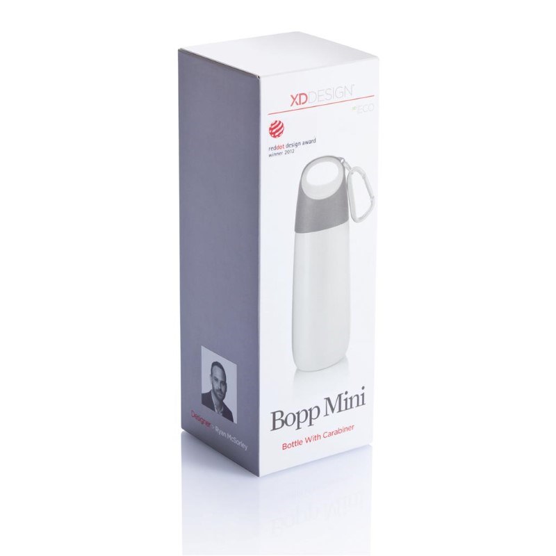 Bopp Mini is een compacte 350ml enkelwandige roestvrijstalen fles met matte finish, deksel in contrasterende kleuren en mat zilveren karabijnhaak (los meegeleverd), die het makkelijk maakt hem overal mee naar toe te nemen. Geregistreerd ontwerp®
