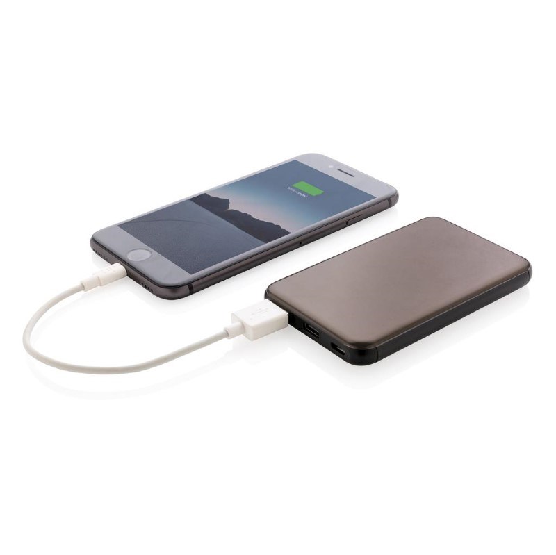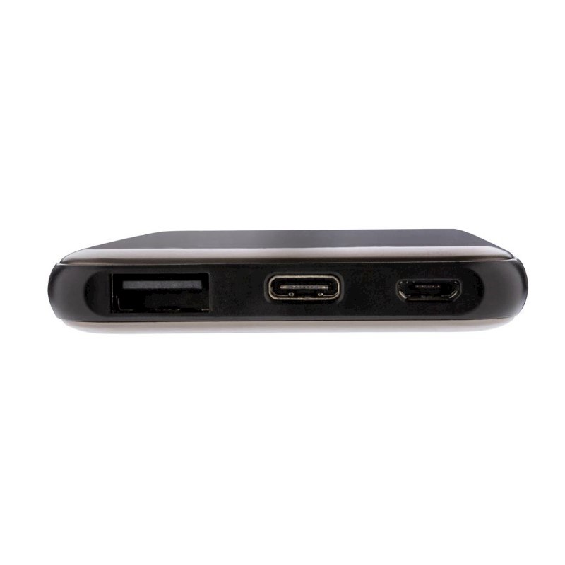 Ultra platte 5.000 mAh powerbank is gemaakt van een hoogwaardige aluminium legering die zo perfect in uw zak past dat je het overal mee naar toe kunt nemen. Als deze volledig is opgeladen, beschikt u over voldoende energie om uw mobiele telefoon maximaal 2 keer op te laden. De powerbank bevat een duurzame high density lithium-polymeerbatterij van 5.000 mAh. De lichten geven het resterende energieniveau aan, zodat u altijd weet wanneer u het apparaat opnieuw moet opladen. Micro USB-poortingang: 5V/2A; Type C-ingang: 5V/2A; Uitgang: USB 5V/2.1A.