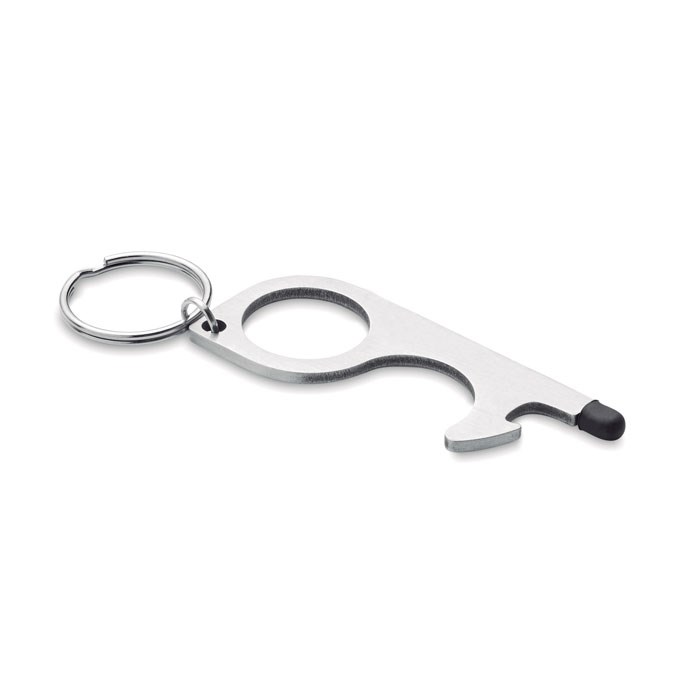 Multifunctionele 5-in-1 roestvrijstalen sleutelhanger No Touch. Open deuren, druk op knoppen van liften, verkeerslichten en geldautomaten of mobiele apparaten contactloos. Inclusief flesopener. Een makkelijke manier om jezelf te beschermen.