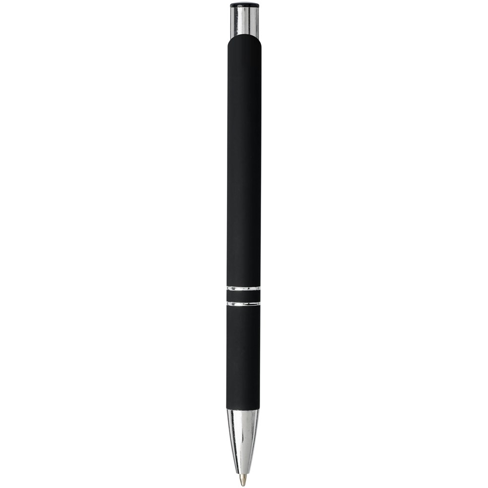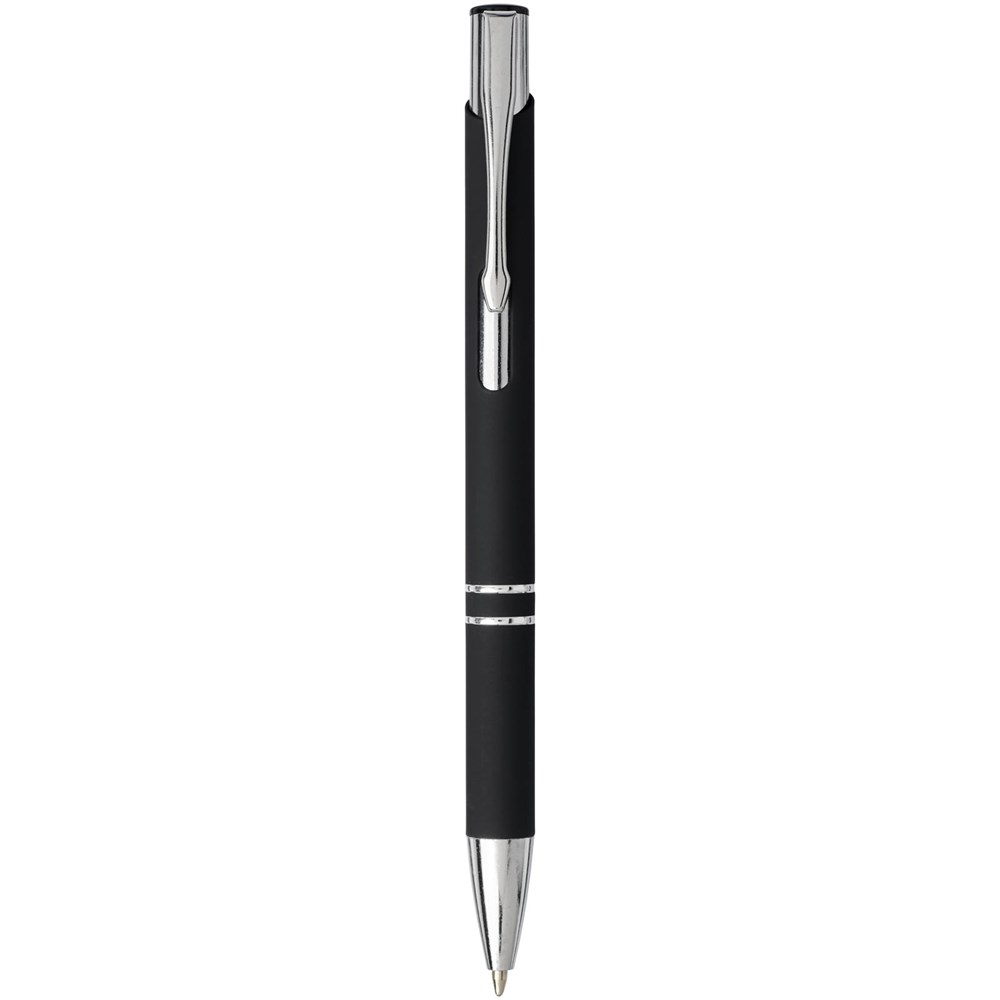 De rubberen coating geeft de pen een zachte touch, en zodra de zilveren onderlaag van de pen met een laser gegraveerd is, wordt de zilveren onderlaag van de pen zichtbaar. Balpen met klikmechanisme met zwarte rubberen coating en verchroomde afwerking en zwarte ABS bovenkant. Het uitgebreide en populaire Moneta-assortiment is verkrijgbaar in vele verschillende stijlen en afwerkingen.