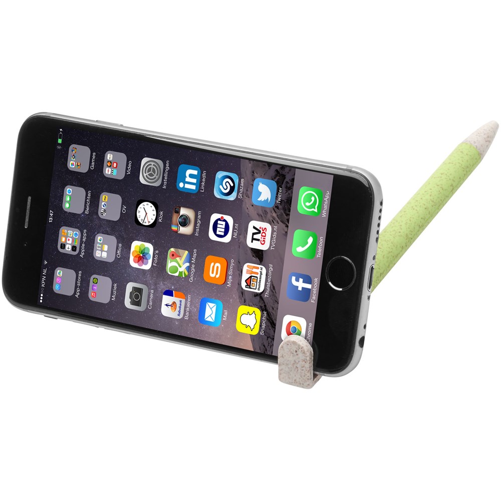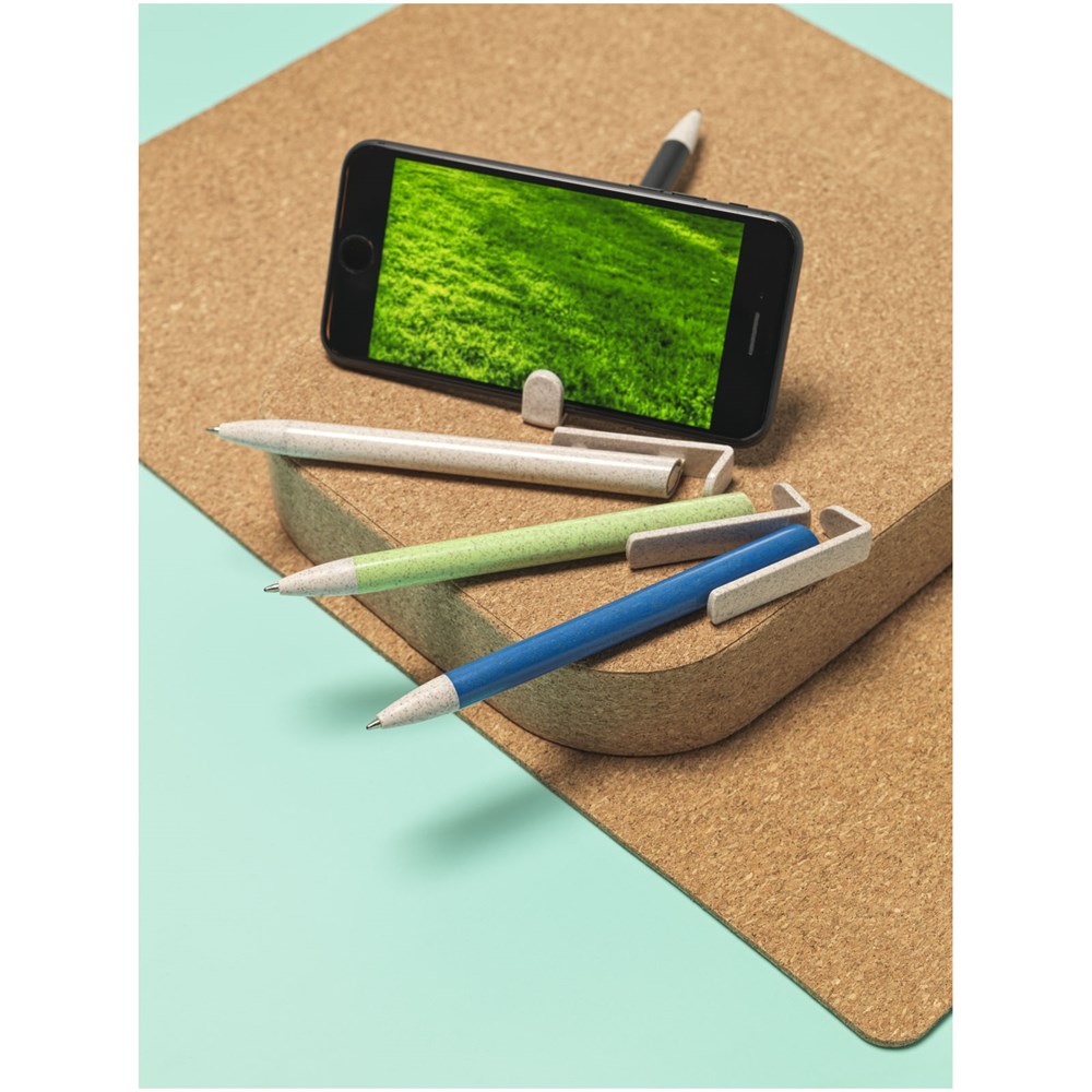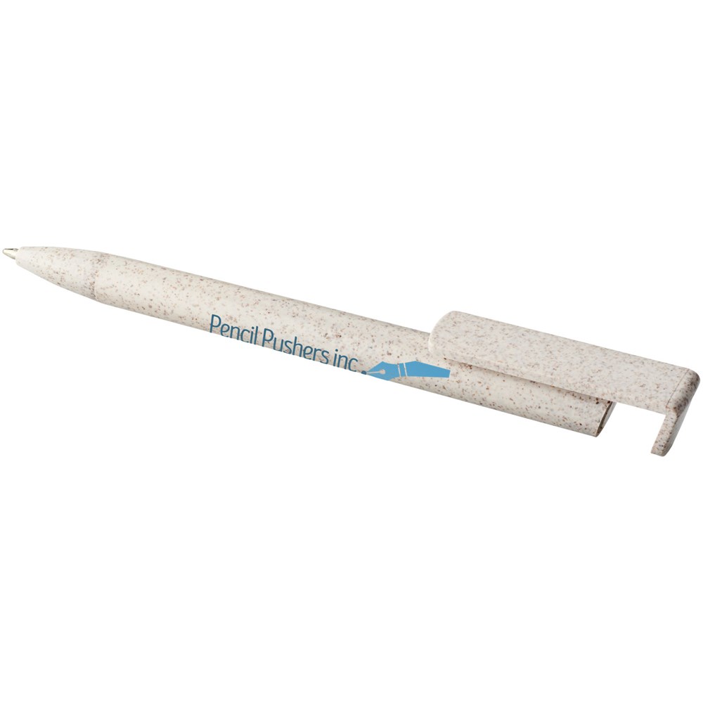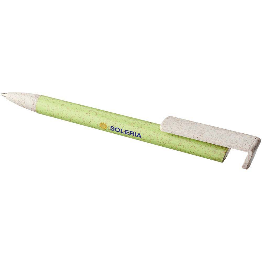 Balpen met klikmechanisme gemaakt van tarwestro. Na het oogsten van de tarwekorrels blijft er tarwestro over, waardoor er minder plastic wordt gebruikt. Het bovenste deel van de pen dient tevens als smartphone-houder voor handsfree gebruik.