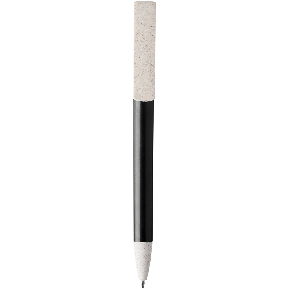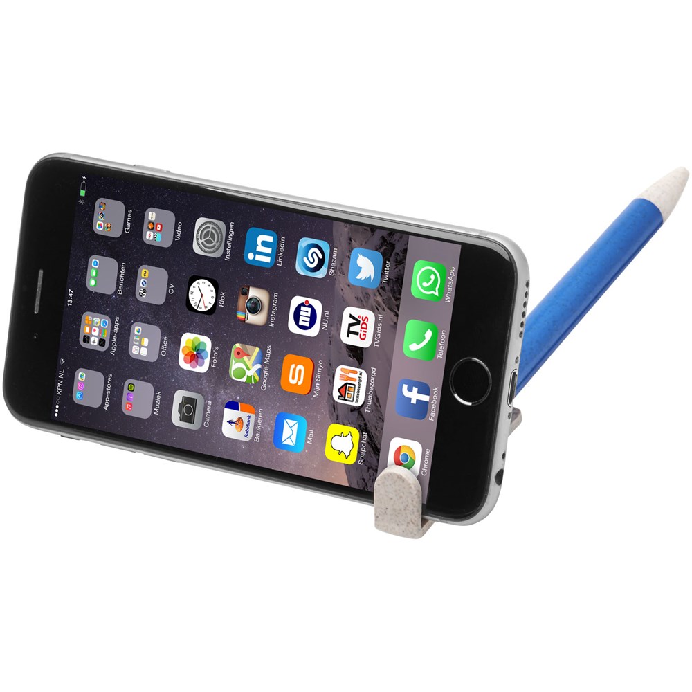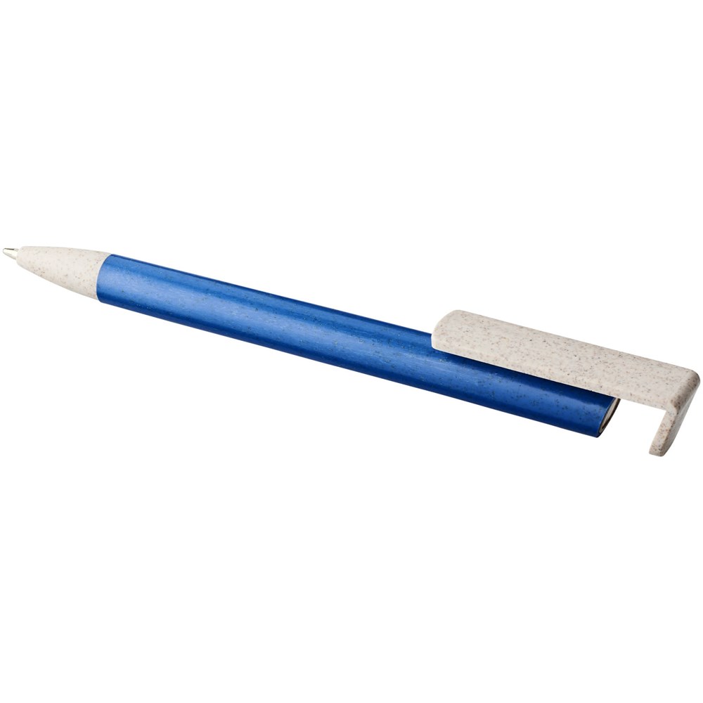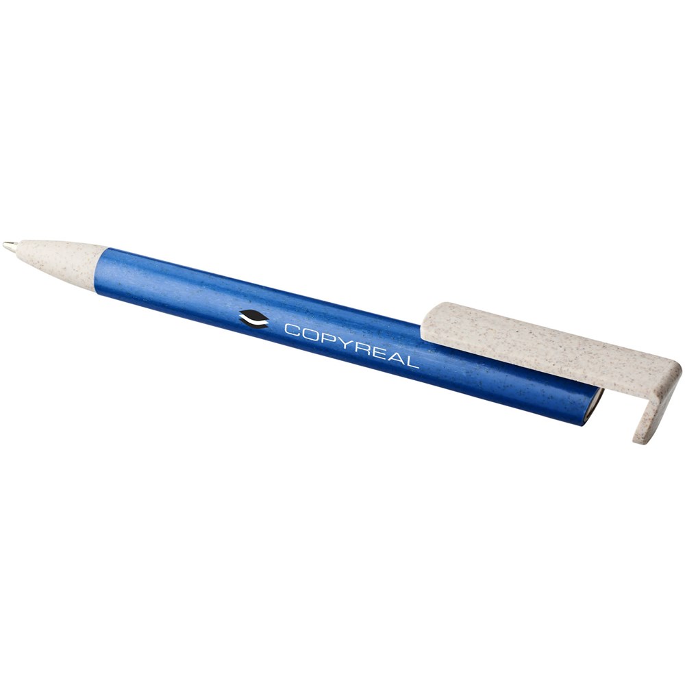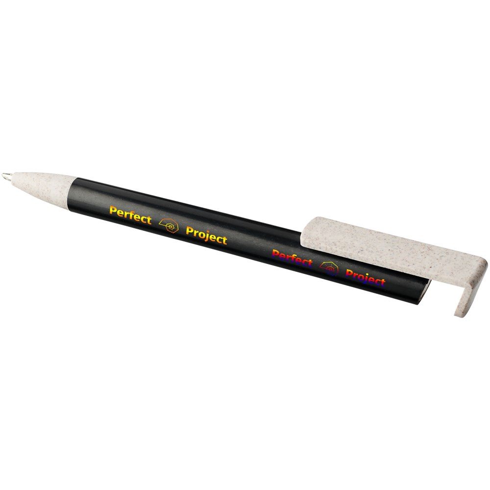 Balpen met klikmechanisme gemaakt van tarwestro. Na het oogsten van de tarwekorrels blijft er tarwestro over, waardoor er minder plastic wordt gebruikt. Het bovenste deel van de pen dient tevens als smartphone-houder voor handsfree gebruik.
