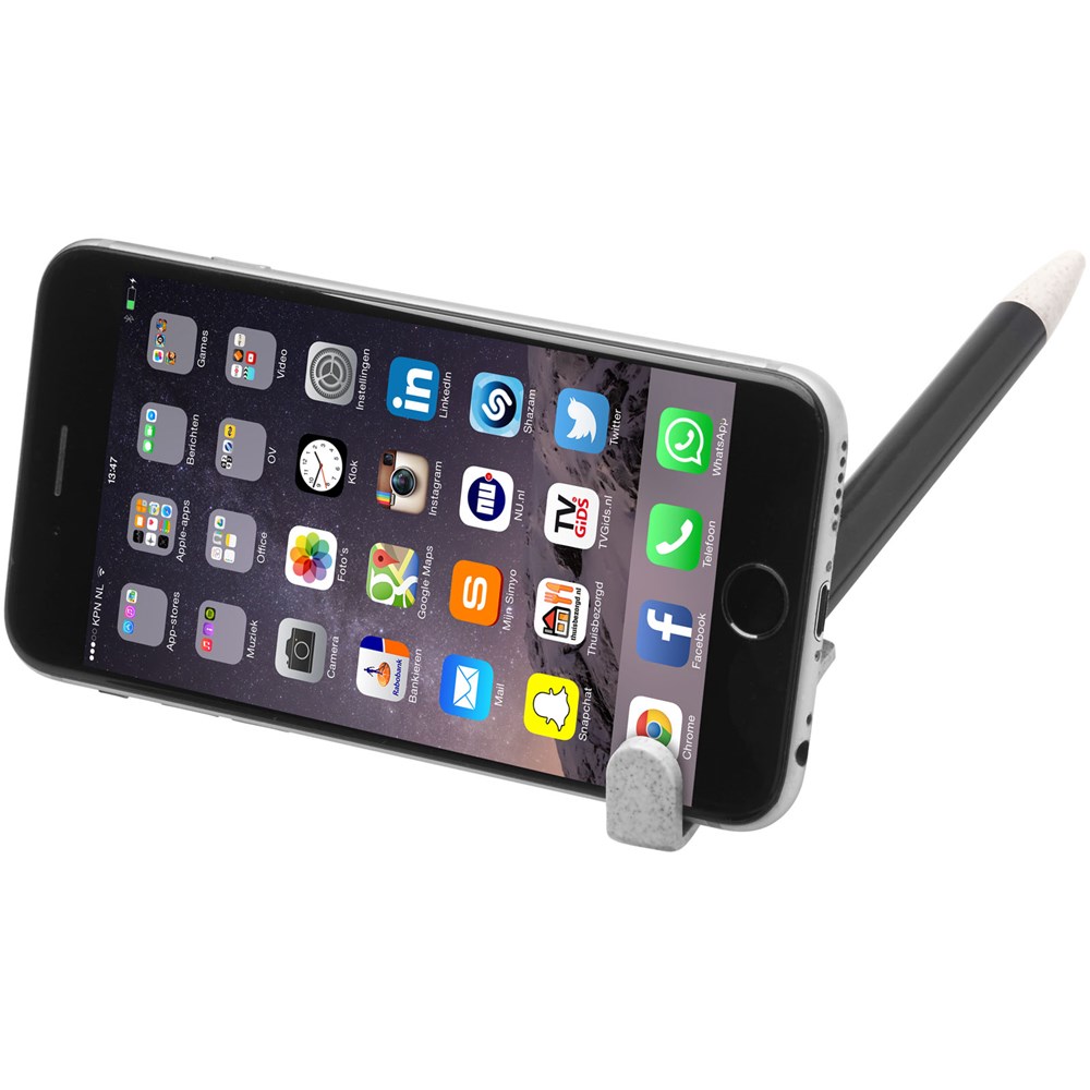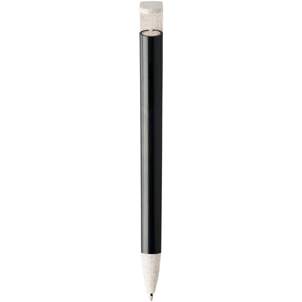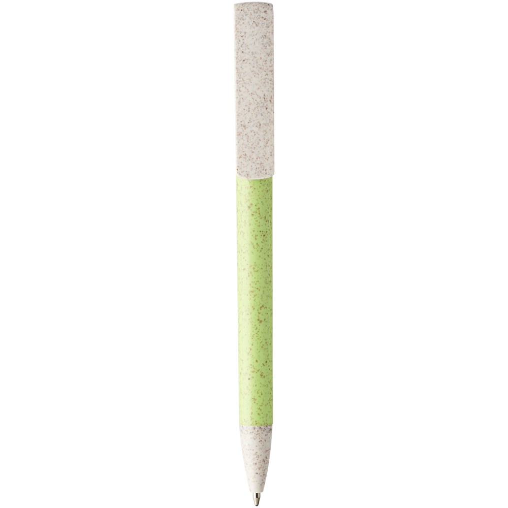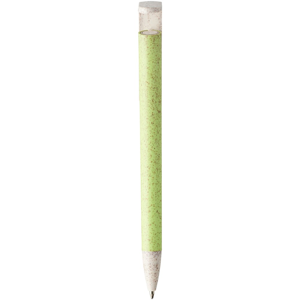 Balpen met klikmechanisme gemaakt van tarwestro. Na het oogsten van de tarwekorrels blijft er tarwestro over, waardoor er minder plastic wordt gebruikt. Het bovenste deel van de pen dient tevens als smartphone-houder voor handsfree gebruik.