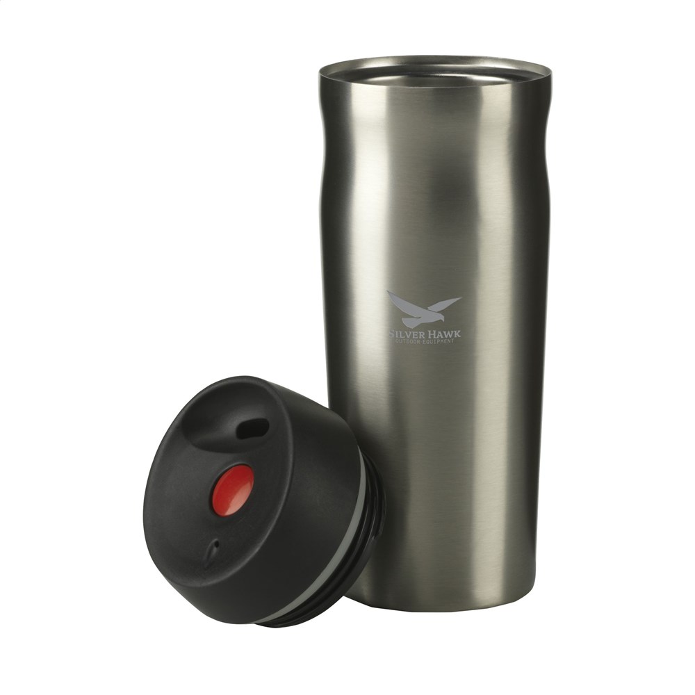 Dubbelwandige thermosbeker van (foodgrade) RVS met schroefdop. Met slechts één druk op de knop opent en sluit de schenkopening zich. Lekvrij. Inhoud 450 ml. Per stuk in doos.