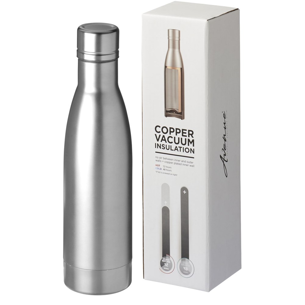 De Vasa drinkfles is dubbelwandig. 18/8 roestvrijstaal met vacuüm isolatie. De binnenwand is van koper voor ultieme geleiding om drankjes tot maximaal 12 uur warm te houden en koud tot maximaal 48 uur. Voorkomt condensatie aan de buitenkant van de fles. Inhoud 500 ml. Geleverd in een Avenue geschenkverpakking.